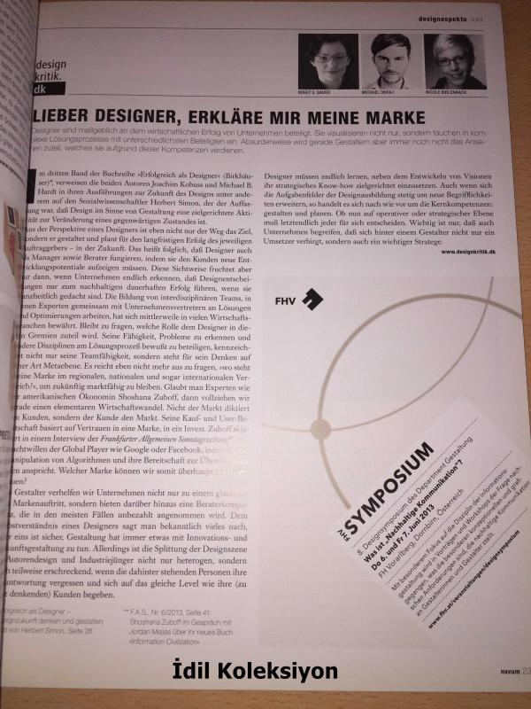 NOVUM World of Graphic Design 06/13 - Internationaol İssue German / English - Grafik Tasarım Dünyası - Almanca , İngilizce Dergi, - tarafından kaleme alınmıştır. Eser - editörlüğünde hazırlanmıştır. Kitap 2013 yılında New Media Magazine Verlag tarafından [Almanya] - ISBN kodu ile yayınlanmıştır. Bu baskının çevirisi - tarafından yapılmıştır. 82 sayfadır. Sayfa bilgisi - olarak belirtilmiştir. NOVUM World of Graphic Design 06/13 - Internationaol İssue German / English - Grafik Tasarım Dünyası - Almanca , İngilizce Dergi adlı eser Almanca dilindedir. Eserin içeriğinde İngilizce dilinde bölümlere de yer verilmektedir.