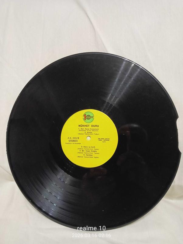 Plak kond: 8 Kapak. :6 Plakta şarkıya girmeyen atık mevcut 1 cm kılcal çatlak mevcut plak dinleti kondisyonu 8 seviyesinde olup atık ve çatlak kısmın ses performansına etkisi yoktur plak temiz almaktadır. Kapak kısmında soyulmalar bulunmaktadır. Plak fiyatı belirtilen kusurlar nedeniyle uygun tutulmuştur.