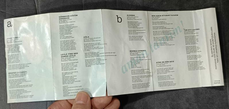 POP 1992 BASKI AZİZ PLAK VE KASETÇİLİK ESERLER: A1 Aman Tanrım A2 Rivayet (Tesadüf) A3 Görmesin Gözüm Giderken A4 Leylâ Yine Her Zaman Leylâ A5 Ağla B1 Aldırma B2 Benimle Oynama B3 Ben Aşkın Kitabını Yazarım B4 Aynada Dün Gece B5 Tak Etti Canıma 2.EL, TEMİZ KARTONET YORGUN VE KIRIŞIKLAR VAR ORİJİNAL VE BANDROLLÜ GÖRSELDEKİ ÜRÜN