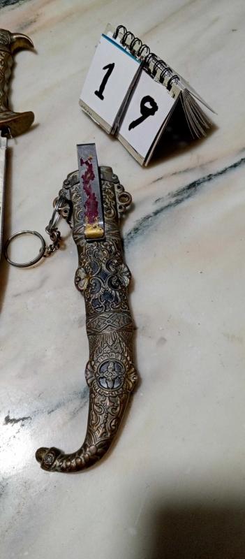Değerli Koleksiyonerlerin ve Tarih Meraklılarının Dikkatine! Bu eşsiz parça, zanaatkarlığın ve estetiğin mükemmel bir birleşimidir. Görüntüde yer alan hançer (veya dekoratif bıçak), detaylı işçiliği ve dikkat çekici tasarımıyla öne çıkıyor. Ürün Özellikleri ve Öne Çıkan Detaylar: Göz Alıcı Kabza ve Kın Tasarımı: Hem kabza hem de kın, karmaşık ve zengin pirinç (veya benzeri metal) işlemeleriyle bezenmiştir. Yüksek kabartmalı desenler, parçanın görsel derinliğini ve antika değerini artırmaktadır. Benzersiz Kabza Şekli: Kabzanın ucundaki kıvrımlı veya kanca benzeri şekil, parçaya mistik ve güçlü bir hava katmaktadır. Detaylı Kın İşçiliği: Kın üzerindeki figürler, desenler ve halkalı bağlantı detayı (anahtarlık halkasına benzer zincir detayı mevcut), parçanın bir zamanlar belki de bir kuşak aksesuarı veya hatıra eşyası olarak kullanıldığına işaret edebilir. Bıçak/Namlu Detayları: Bıçağın bir yüzünde görülebilen "BUSTER S...T." yazısı ve muhtemelen bir figür içeren renkli baskı/dekorasyon (keskin bir av bıçağından ziyade daha çok hatıra/dekoratif amaçlı bir parça olduğunu düşündürmektedir), koleksiyon değeri açısından önemli bir kimlik bilgisidir. Neden Bu Parçayı Satın Almalısınız? Dekoratif Değer: Ev, ofis veya koleksiyon vitrininize anında karakter ve tarihi bir dokunuş katacaktır. Koleksiyonluk: Üzerindeki yazılar ve detaylı işçilik, spesifik bir üreticiye veya döneme ait olabileceği için nadir bir koleksiyon değeri taşır. Mükemmel Hediye: Tarihi objelere, silahlara veya gotik/fantastik temalı eşyalara ilgi duyan birine verilebilecek eşsiz bir hediyedir. Bu büyüleyici ve sanatsal parçayı koleksiyonunuza katma fırsatını kaçırmayın!Ürün Kodu: (25 ymm 1500)
