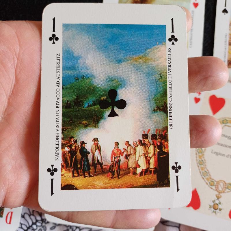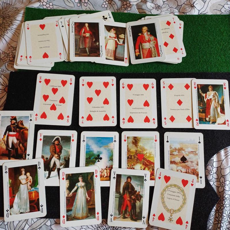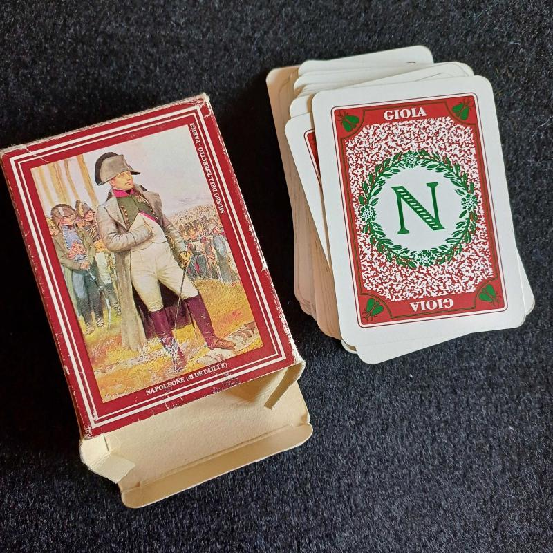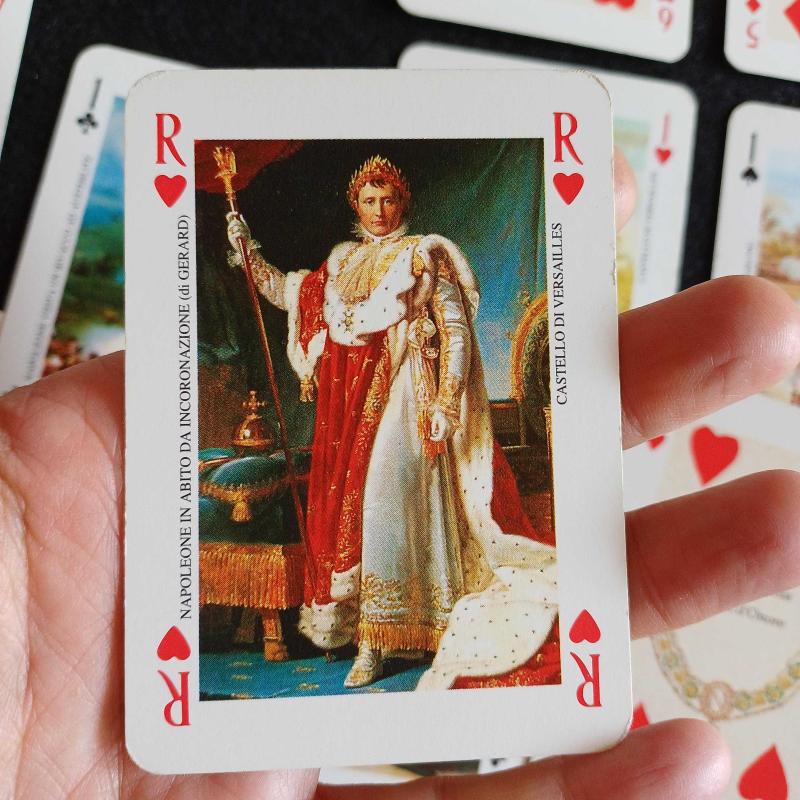 Eşsiz güzellik ve özellikte,koleksiyonluk İtalyan Oyun Kağıdı Markası Mondiano tarafından hazırlanmış ,Edition Dusserre tarafindan 1987 yiilinda Fransa'nin Buyuk Krallari Serisinden Napoleone Benapaurte kağıt destesi. Oynamaya kiyilamayacsk güzellikte. Resimli kartlarda,Versaille Sarayında yeralan kral ve kraliçelerin portre tablolari basılmış. Ayrıca yapılan savaşların resmedildigi tablolar '1' oyun kartlarına basılmış. Diğer kartların herbirine Fransa tarihinin önemli günleri ve içerikleri yazılmış. Her kartın arka yüzünde 'N', logosu mevcut. Kağıtlar mükemmel durumda. Kutunun genel durumu çok iyi. 52 +2 joker