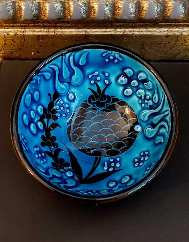Nar ve Lale Kabartma Temalı, Turkuaz-Siyah Renkli Kütahya Çini Kase. 2016, Kaliteli El İşçiliği (3.5x8 cm), 3 ay önce kitantik’te satışa sunulmuştur.