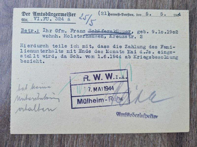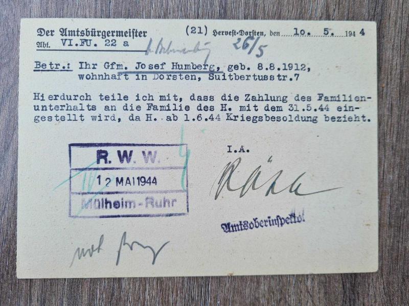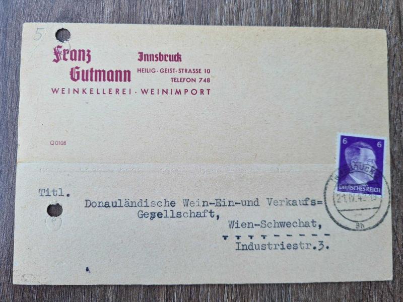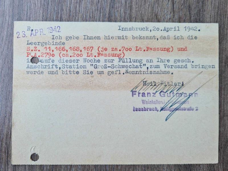 Nazi rejiminin iç bürokratik yapısına, savaş ekonomisine ve propaganda diline dair eşsiz 3 orijinal belge 1942–1944 yılları arasında Almanya’da gönderilmiş ve tamamı pullu, damgalı ve yazışmalı üç farklı resmî kart bulunmaktadır. Bu belgeler, yalnızca posta koleksiyoncuları için değil, aynı zamanda sosyal tarih ve Nazi dönemi Almanya’sını inceleyen araştırmacılar için de çok değerlidir. İçerik Özeti: 1. Kriegsbesoldung Bildirimi – Josef Humberg (10.05.1944, Dorsten) Ailesine ödenen devlet yardımı, 31 Mayıs 1944 itibarıyla durduruluyor. Gerekçe: 1 Haziran 1944’ten itibaren askeri maaş (Kriegsbesoldung) alması. R.W.W. Mülheim-Ruhr damgalı, Hitler portreli 6 Pfennig pulu mevcut. 2. Kriegsbesoldung Bildirimi – Franz Schäfersküper (05.05.1944, Holsterhausen) Benzer içerikte ikinci orijinal kart. R.W.W.I.A. damgası, net 7. Mai 1944 tarihi ve mor Hitler pulu mevcut. 3. Ticari Bildirim – Franz Gutmann Şarap Ticareti, Innsbruck (20–23 Nisan 1942) 200 ve 700 litrelik boş şarap fıçılarının Viyana’ya gönderimi bildiriliyor. Son satırda: “Heil Hitler!” ibaresi ve şirket sahibi Franz Gutmann’ın mührü ve imzası 6 Pfennig Hitler pulu ve Innsbruck 21.4.42 damgası net şekilde görülebilir.