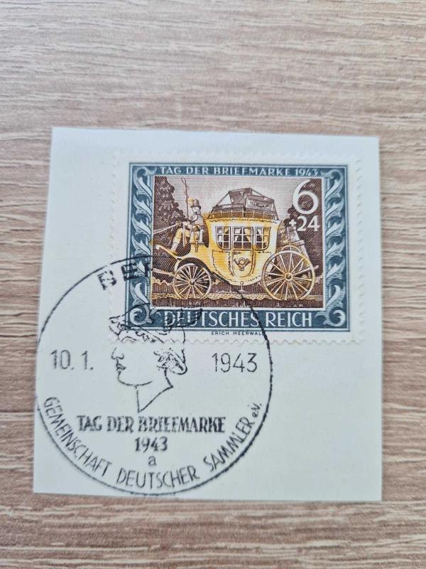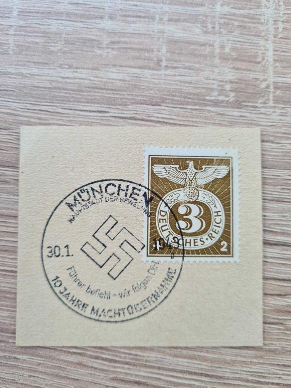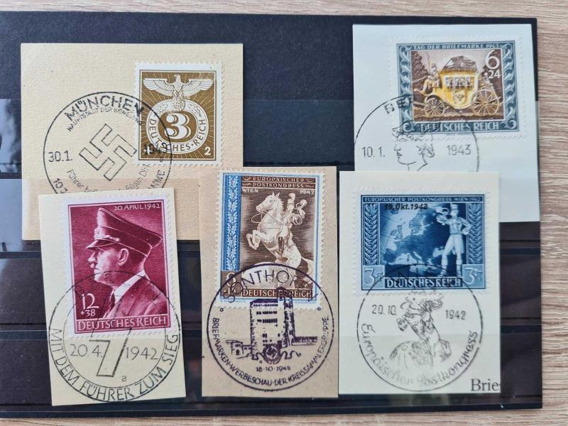 Hepsi orijinal dönem içi kullanılmış ve özel hatıra damgalarıyla iptal edilmiş pullar. Pullar zarf üzerinden kesilip damga tam haliyle korunmuş (“on piece”), bu koleksiyon açısından sıradan damgalı puldan daha değerlidir. 1- 20 Nisan 1942 Hitler portreli yardım pulu (12+38) Üst yazı: “20. APRIL 1942” Alt yazı: “DEUTSCHES REICH” Damga: Büyük yuvarlak özel tarih damgası “MIT DEM FÜHRER ZUM SIEG – 20.4.1942”. Bu damga doğrudan rejim propagandası ve Hitler’in doğum günü anmasıyla ilişkilidir. Koleksiyonluk bir Sonderstempel’dir. 2- Kahverengi 3+2 pulu (kartal ve gamalı haç arma) Damga: “MÜNCHEN … 10 JAHRE MACHTÜBERNAHME / Führer befiehl – wir folgen Dir” Tarih: 30.01.1933 (iktidara geliş yıldönümü). Münih özel iptali; bu tarz damgalar Nazi iktidarının 10. yılı anmalarında kullanıldı. Özellikle Münih iptalli olanlar aranır. 3- “Europäischer Postkongress Wien 1942” temalı mavi pul (3+5) Tasarım: dünya haritası üzerinde posta habercileri. Damga: Avrupa Posta Kongresi özel iptali, figürlü illüstrasyonlu dairesel damga (20.10.1942). Posta tarihi / iletişim tarihi koleksiyoncuları için güzel bir parça, politik temalılardan daha nötrdür. 4- Konulu kahverengi/mavi atlı ulak pulu (1+4) Üstte “EUROPÄISCHER POSTKONGRESS WIEN 1942”. Damga: Büyük morumsu yuvarlak iptal, bina çizimiyle birlikte. Bu iki Postkongress pulu birlikte sunuluyor; kongre hatıra iptalli “on piece” olarak oldukça şık set oluşturuyor. 5- “Tag der Briefmarke 1943” posta dili pulu (6+24) Tasarım: atlı posta arabası / posta dili. Damga: “Tag der Briefmarke 1943 – Gemeinschaft Deutscher Sammler – 10.1.1943”. Bu, filatelist kulüplerinin pul gününde bastırdığı özel hatıra damgasıdır. Filateli temalı koleksiyonlarda klasik bir parçadır. Kondisyon: Pullar temiz damgalı, iptaller net okunuyor (tarih, şehir, slogan, semboller belirgin). Dişler genel olarak düzgün; yırtık/kopma yok. Renkler canlı. Her pul küçük zarf parçası üzerinde duruyor, yani “on piece” formatında, bu da sahiciliği gösteriyor. Bu lotu özel yapan şeyler: 1942 Hitler doğum günü iptali 10.Yıl iktidar anması “Münih” özel damgası 1942 Viyana Avrupa Posta Kongresi iki farklı değerle 1943 “Tag der Briefmarke” (Pul Günü) hatıra iptali Hepsi tek pakette bu kadar temiz bulunmaz; normal karışık Nazi dönemi pullarından bir seviye üstte çünkü hepsi belge niteliğinde propaganda / etkinlik / kongre damgaları taşıyor.