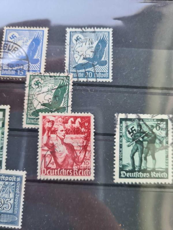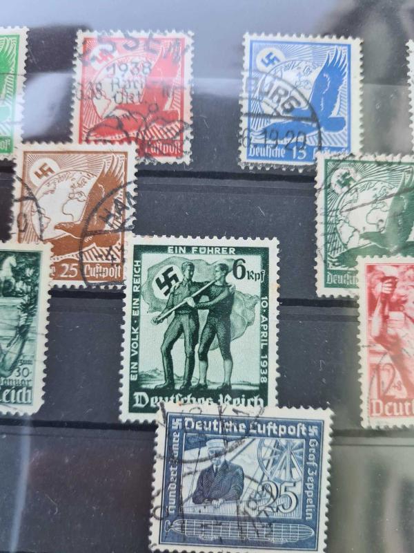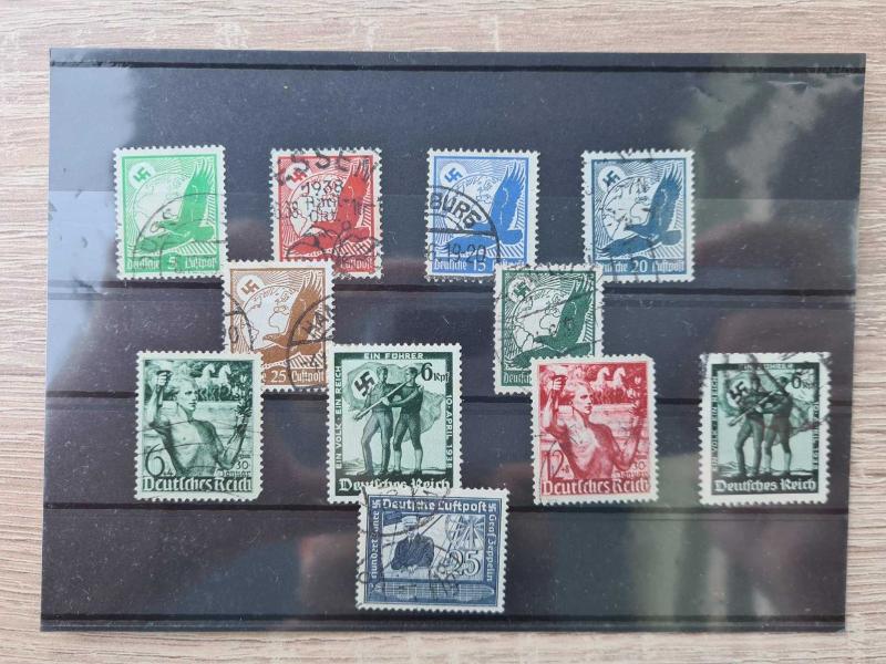II. Dünya Savaşı öncesi ve dönemi Almanya’sına ait orijinal, dönem içi kullanılmış (damgalı) pullardan oluşan karışık lot. İçinde hava postası (Luftpost), Graf Zeppelin temalı pul, Anschluss propagandası (“Ein Volk • Ein Reich • Ein Führer”), 30 Ocak temalı rejim yıldönümü pulları ve kartal/svastika üstünde dünya küresi tasarımlı Luftwaffe dönemi hava postaları var. Lot içeriği ana gruplar halinde: 1- Luftpost / Hava Postası Pulları (kartal-dünya küresi temalı seri) Yeşil 5, kahverengi 25, kırmızı 12, mavi 15, koyu mavi 20 vb. Tasarım: Dünya küresi üzerinde uçan kartal ve köşede svastika. Bu seri Almanya’nın hava postası propagandasını taşır. Hepsi gerçek postal kullanım damgalı (iptalli). Damga okunur olması koleksiyon için önemlidir. 2- “Deutsche Luftpost / Graf Zeppelin / 25” mavi pul Hava postası ve Graf Zeppelin göndermeli tasarım (hava gemisi / zeplin illüstrasyonu). Bu tip pullar zeplin ve erken uzun menzil uçuş temalı koleksiyonlarda aranır. Üzerinde posta damgası mevcut, yani gerçek sirkülasyonda kullanılmış. 3- “Ein Volk • Ein Reich • Ein Führer – 10. April 1938 / 6 Rpf” (yeşilimsi ton) Avusturya’nın ilhakı (Anschluss) propagandasına ait tipik pul. İki figür bayrak taşıyor, üstte svastika. Hem yeşilimsi tonlu hem de başka iptalli varyantını da görüyorum (lotta birden fazla benzeri var). Bu pul doğrudan rejim propagandası olduğu için tarihî belge niteliğinde kabul edilir. 3- “Zum 30. Januar” (30 Ocak yıldönümü) temalı çıplak gövdeli genç adam figürlü pullar Yeşil tonlu 6 Rpf ve kırmızı tonlu 12 Rpf versiyonlar. Arka planda atlı heykel tarzı kahramanlık kompozisyonu. 30 Ocak, rejimin iktidara geliş yıldönümü olarak anılır; bu yüzden bunlar da propaganda kategorisindedir. Önemli: Damgalı olmaları orijinal dolaşım kanıtıdır. Genel durum / kondisyon: Tümü damgalı (kullanılmış). Bu normal ve beklenen; dönem içi orijinalliği destekler. Renkler hâlâ canlı, okunabilir. Dişler genel olarak düzgün; bazı pullarda doğal dolaşım kaynaklı hafif yıpranma var ama yırtılmış/kırpılmış gibi ağır kusur görünmüyor. Koleksiyonluk “iyi” kondisyonda. Vitrine konabilir. Neden koleksiyonluk? Sadece tek tip değil, farklı propaganda temalarını aynı lotta topluyorsun: hava postası / Luftwaffe imajı, Anschluss propagandası, rejim yıldönümü, zeplin posta tarihi. Zeppelin temalı pul filateli içinde ayrı bir ilgi alanıdır. Bu tarz damgalı orijinaller, “tarihi geçti elime yeni basıldı” tip kopya değil; gerçekten dönemde posta üzerinde dolaşmış materyal.