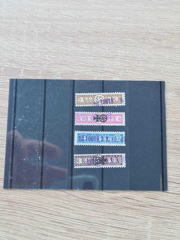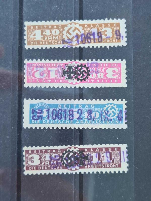Nazi Almanyası dönemine ait, Deutsche Arbeitsfront (DAF / Alman İşçi Cephesi) üyelik ve aidat ödemelerini belgelemek için kullanılan resmi katkı pullarından oluşan 4’lü set. Bunlar normal posta pulu değildir; DAF üye kartlarına yapıştırılıp damgalanan “aidat makbuzu pulları”dır. Set içeriği: Farklı renk ve sınıflarda 4 adet DAF aidat pulu Üzerlerinde “DIE DEUTSCHE ARBEITSFRONT” ibaresi, katkı sınıfı (“KLASSE”) ve RM tutarları görülüyor Her birinin üzerinde dönemine ait mor/mavi/siyah mühür damgası ve numaralandırma mevcut Bazılarında çark içindeki gamalı haç ve siyah demir haç tarzı mühür dikkat çekicidir Durum: Dişler büyük ölçüde sağlam, yırtık yok Renkler canlı, solma yok Hepsi gerçek kullanım damgalı (yani gerçekten bir üyelik kartına yapıştırılıp onaylanmış) Koleksiyonluk olarak temiz/özgün görüntüde Orijinal dönem baskısıdır, replika değildir DAF (Deutsche Arbeitsfront) aidat pulları Türkiye’de posta pullarına göre daha az bulunur Dört farklı değerin bir arada olması seti tamamlanmış görüntüye getirir Not: Tarihsel/filateli-efemera amaçlı koleksiyon ürünleridir. Herhangi bir ideolojik amaç yoktur.