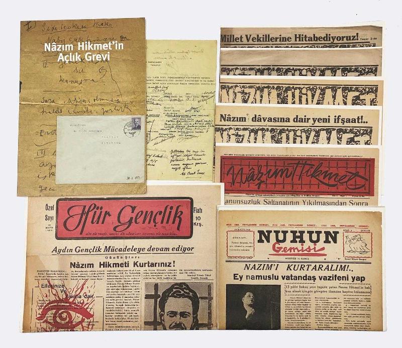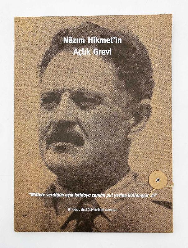 Özgün karton potfolyusu içinde, metin kısmı çok temiz durumda, 36 x 27 cm, 47 sayfa, renkli ve s/b resimli. "Nâzım Hikmet'in açlık grevi. (Tıpkıbasımlar: 2 Mektup, 3 Belge, 10 Sayı Nazım Hikmet Dergisi, 2 Sayı Hür Gençlik Dergisi,1 Sayı Nuhun Gemisi Dergisi)." NÂZIM HİKMET RAN. İstanbul Bilgi Üniversitesi Yayınları, İst., 2011. Bu dosya 1500 adet basılmış ve numaralandırılmıştır. No: 214. Nâzım Hikmet, 28 Aralık 1938’de Askeri Yargıtay’ın onaylamasıyla hiçbir suçu olmadan toplam 28 yıl 4 ay ağır hapis cezasına çarptırıldı. Şaire isnat edilen suç “orduyu isyana teşvik etmek”ti. 1949 yılına gelindiğinde Nâzım toplam 12 yılını hapishanede geçirmişti. Ve kendince artık dayanma sınırına gelmiş ve farklı “mücadele yollarını” denemeye hazırlanıyordu.Sonunda Nâzım 8 Nisan 1950’de açlık grevine başladı. Avukatının isteği üzerine açlık grevini bir süre durduran şair, 1 Mayıs 1950’de tekrar greve başladı, 13 Mayıs’ta Cerrahpaşa Tıp Fakültesi Hastahanesi’ne kaldırıldı. Sonunda 19 Mayıs 1950’de açlık grevine son verdi. Bu arada iktidar değişecek ve 14 Temmuz 1950’de çıkarılan af yasasıyla da Nâzım Hikmet tahliye edilecekti.