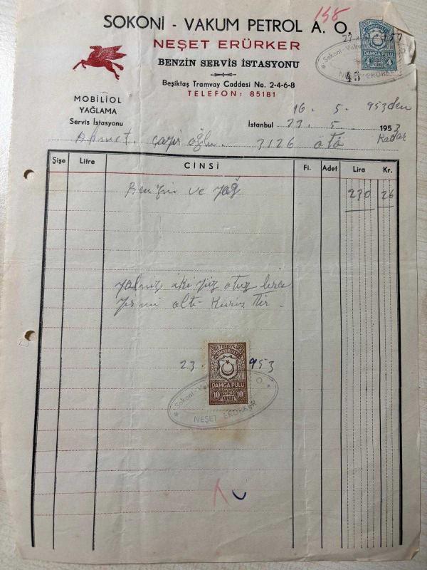 Neşet Erürker-OTOMOBİL BENZİN, YAĞ FATURASI - 23 MAYIS 1953 - SOKONİ - VAKUM PETROL A.O. - BENZİN SERVİS İSTASYONU - BEŞİKTAŞ , İSTANBUL - AHMET ÇAYIROĞLU - ISLAK İMZALI, KAŞELİ DAMGA PULU - 28 x 21 cm EBATLI ORİJİNAL FATURA, en son 1 yıl önce güncellenmiştir.
