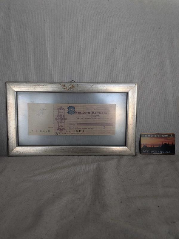 (No19) Osmanlı Selanik Bankası kullanılmamış çek, 18x31cm cam paspartülü ahşap çerçeveli,