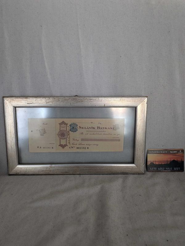 (No21) Osmanlı Selanik Bankası kullanılmamış çek, cam paspartülü 18x31cm ölçülerinde çerçeveli