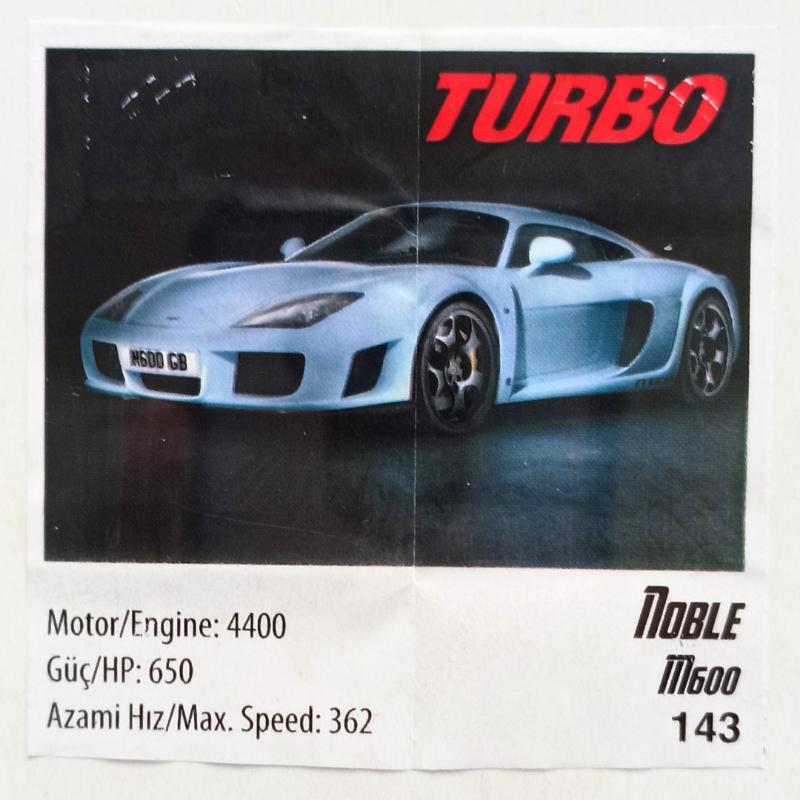 Noble M600 Turbo Araba Turbo Sakız Kağıdı No 143 başlıklı antika/koleksiyon objesi Türkiye menşe’lidir. 2000 ve sonrası dönemine aittir.