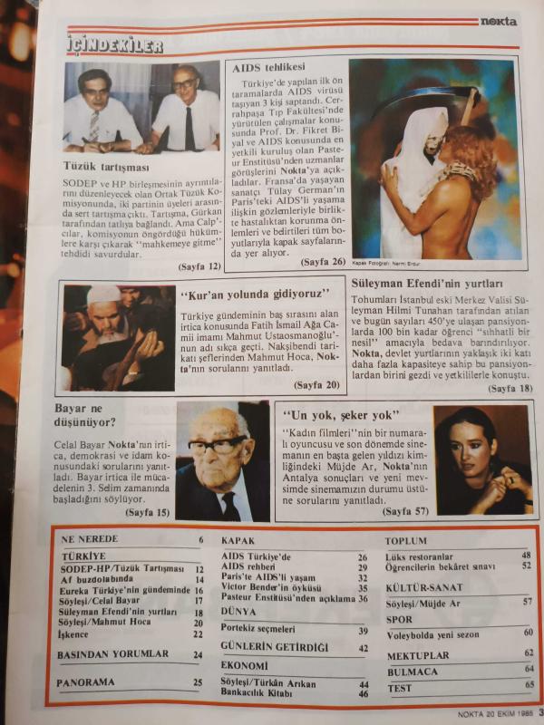 Nokta Dergisi - 20 Ekim 1985 - AIDS tehlikesi - Tüzük tartışması - Süleyman Efendi'nin yurtları - Kur'an yolunda gidiyoruz - Müjde Ar - Voleybolda yeni sezon - Öğrencilerin bekâret sınavı - Lüks restoranlar - Türkan Arıkan - Portekiz seçmeleri - Celal Bayar - Paris'te AIDS'li yaşam - Victor Bender'in öyküsü - Bankacılık Kitabı - Pasteur Enstitüsü'nden açıklama -