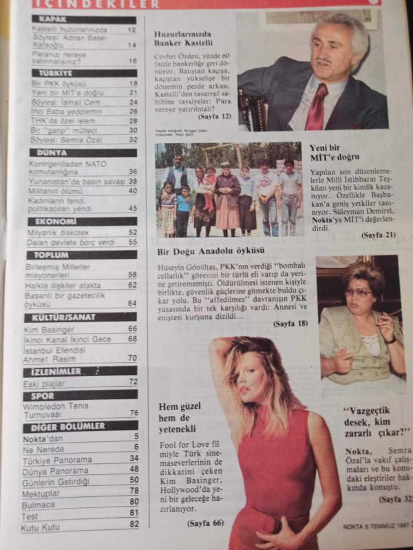 Nokta Dergisi - 5 Temmuz 1987 - Adnan Başer Kafaoğlu - Bir PKK öyküsü - Yeni bir MİT'e doğru - İsmail Cem - İnci Baba Yeddiemin - THK'da özel işlem - Semra Özal - Kontrgerilladan NATO komutanlığına - Yunanistan'da basın savaşı - Militanın ölümü - Milyarlık diskotek - Dalan devlete borç verdi - Birleşmiş Milletler misyonerleri - Halkla İlişkiler atakta -