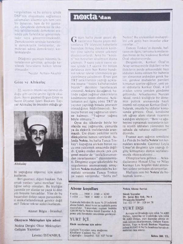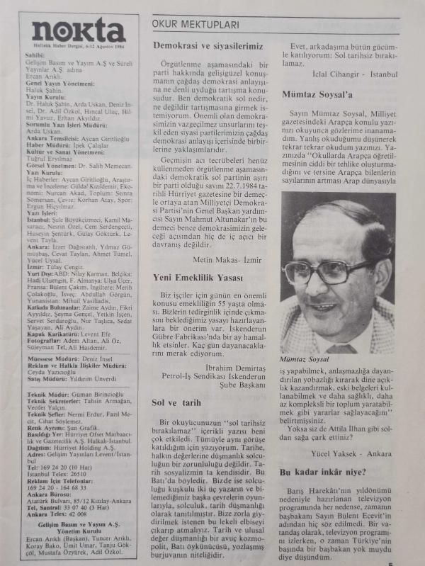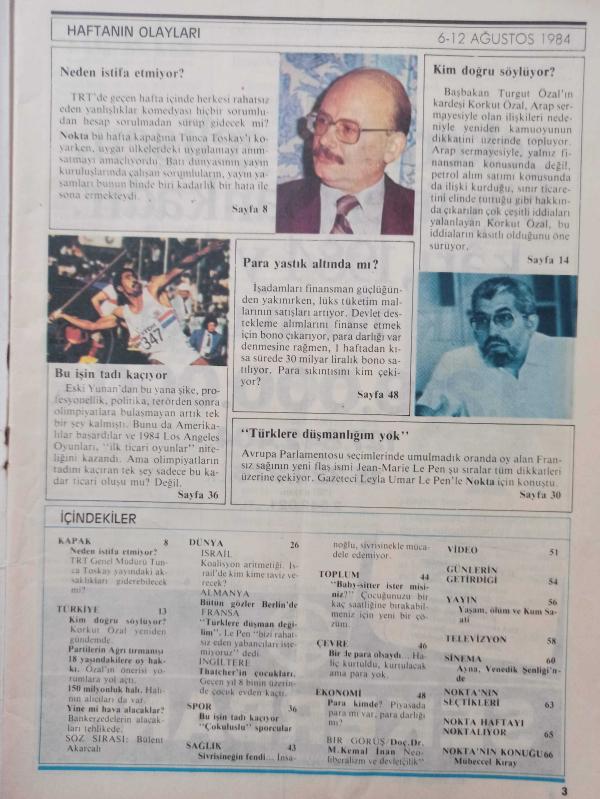 Nokta Dergisi - 6-12 Ağustos 1984 - Partilerin Ağrı tırmanışı - 18 yaşındakilere oy hakkı - 150 milyonluk halı - Sivrisineğin fendi - Dr. M. Kemal İnan - Neden istifa etmiyor? - Kim doğru söylüyor? - Para yastık altında mı? - Türklere düşmanlığım yok - Bu işin tadı kaçıyor - Okur Mektupları - Mümtaz Soysal - Yağmur yağdı böyle oldu - Toskay ne yapmalı? - Unutulan Radyo - adlı eser Türkçe dilindedir.