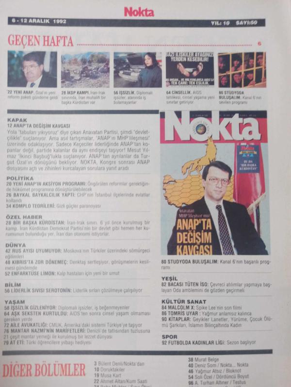 Nokta Dergisi - 6-12 Aralık 1992 - ANAP'ta değişim kavgası - Moskova'da kongre kavgaları - Ölmeyen aşkın sırrı - Değişik bir objektiften Mesut Yılmaz - Turgut Özal - Politikada Komplo Teorileri - Çok partili, tek görüşlü düzen - Bir zamanlar bir ANAP vardı - Rus Ayısı uyumuyor - Türkiye modeli fazla Avrupai - Kıbrıs'ta zor dönemeç - Küspeden akaryakıt -