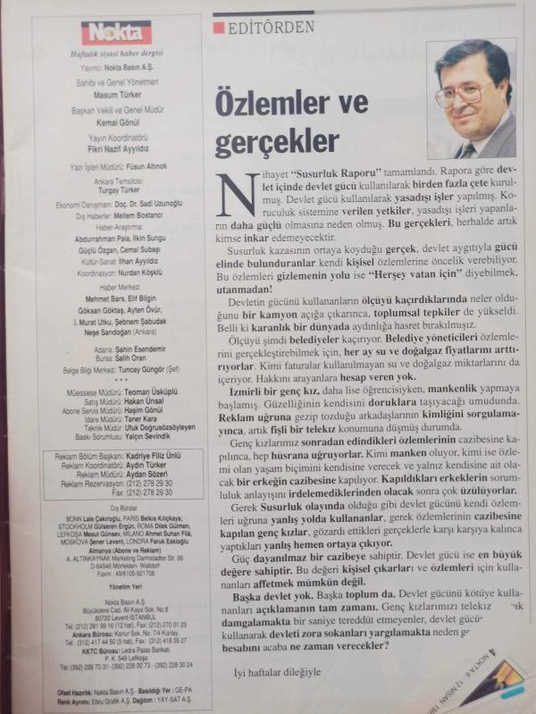 Nokta Dergisi - 6-12 Nisan 1997 - Politika dışı inancın sesini bulduğu adam: Yaşar Nuri Öztürk - MHP erken seçim istiyor - Siyasal ahlaka sözleşme metni - Türkiye'nin demokrasi sorunu - Hasreti prangalar eskitiyor - Toplu intiharlar yılı 2000 - Kadın ve lastik - Ateş topundan sanat eserine - Ortadoğu barışı tehlikede - Görünmeyen gizli vergi, enflasyon -