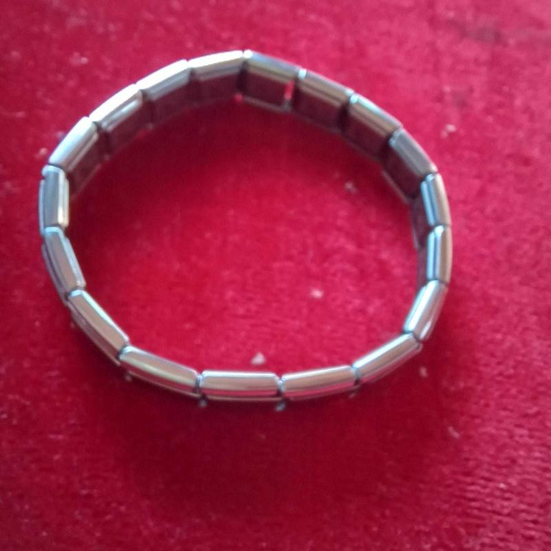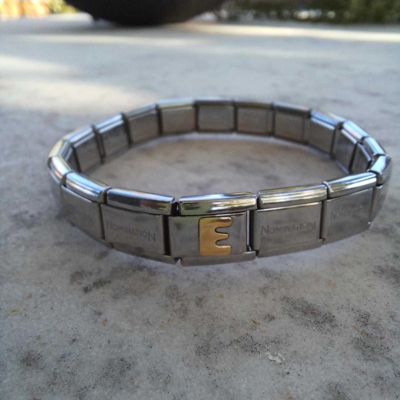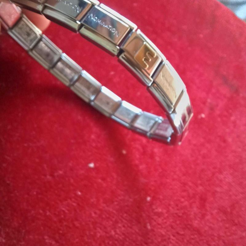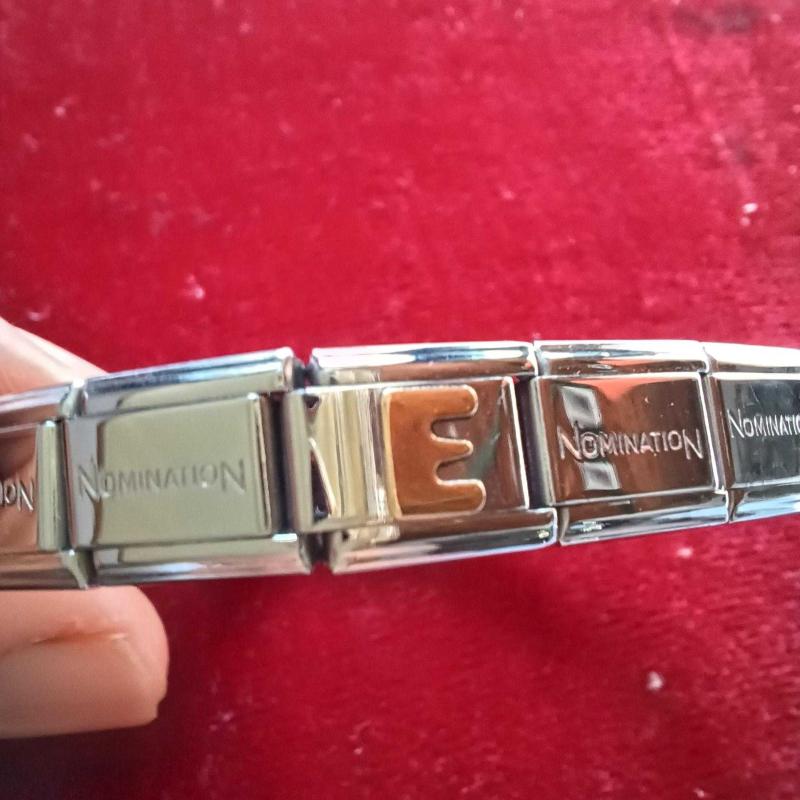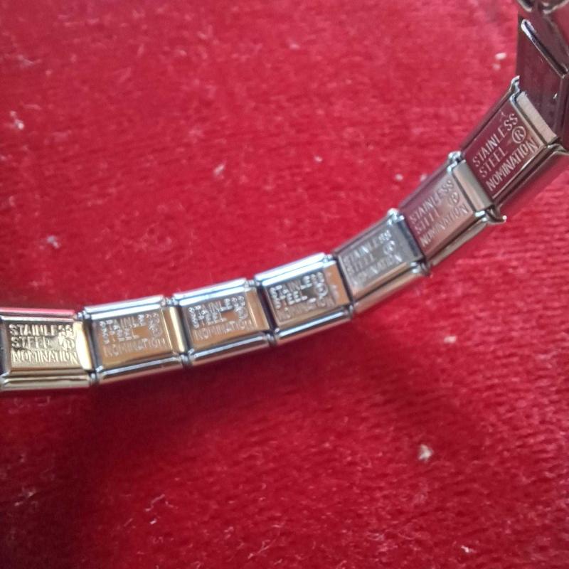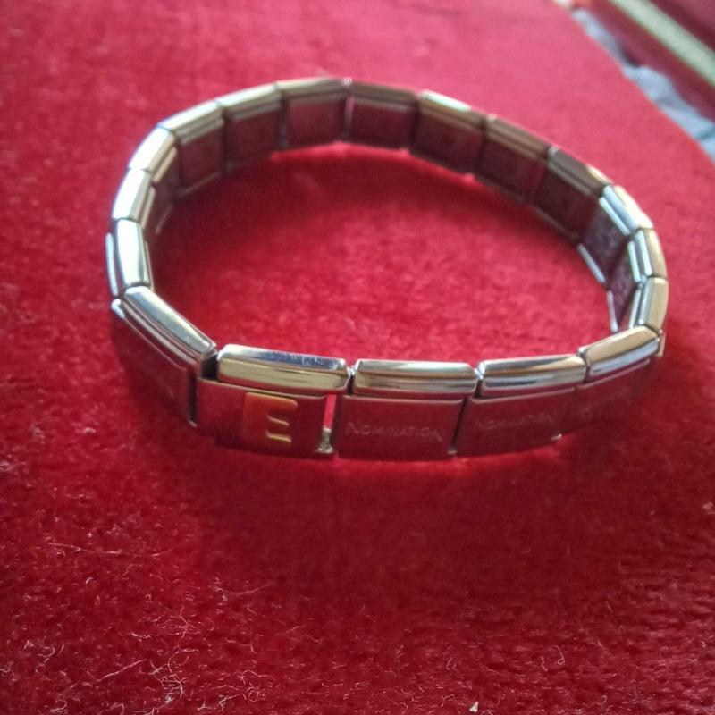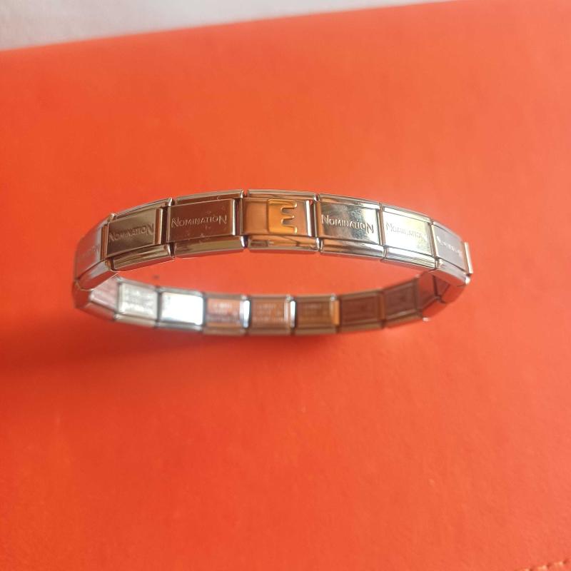 Italyan Nomination paslanmaz çelik bileklik. Vintage.Cok iyi durumda. Kullanima dair hafif izler olabilir. 'E' charm dahil 18 parca. 16 ,17 cm bilek olcusune uygun. Orjinal. Her parca i(charm sadece icte damgali) ıcte ve dista damgali. Dista Nomination,içte stainless steel nomination R damgali. Genislik 8 mm.