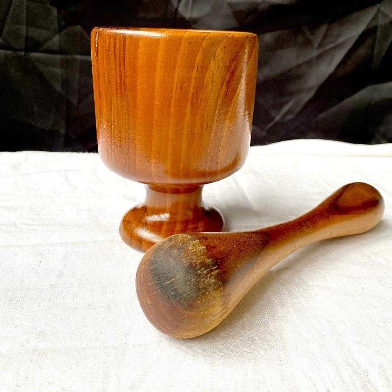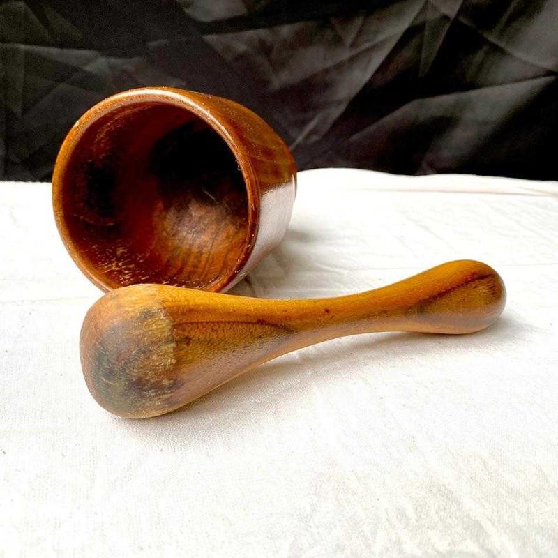 Oldukça eski, el üretimi ahşap baharat havanı. Havan ve tokmağı çok iyi durumda, herhangi bir çatlak vs yoktur. Ahşabı besleyip koruması için yüzeyine ince bir kat keten tohumu yağıyla bakım yapıldı. Yükseklik: 11 cm (Havan tokmağı hariç) Çap: 8 cm 250 gr