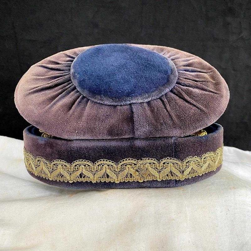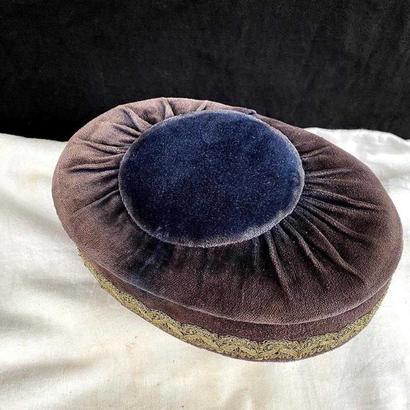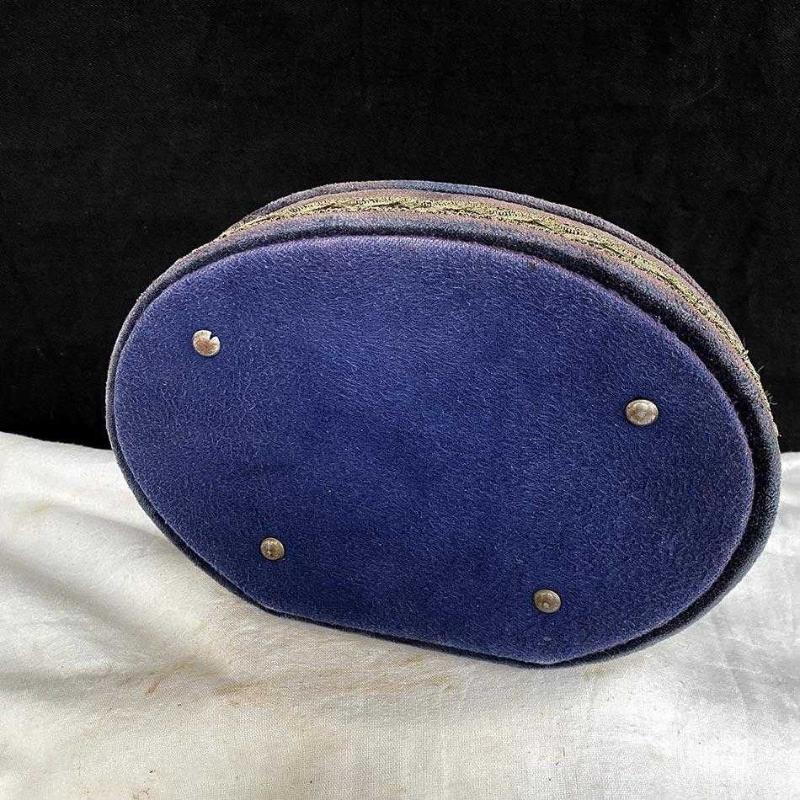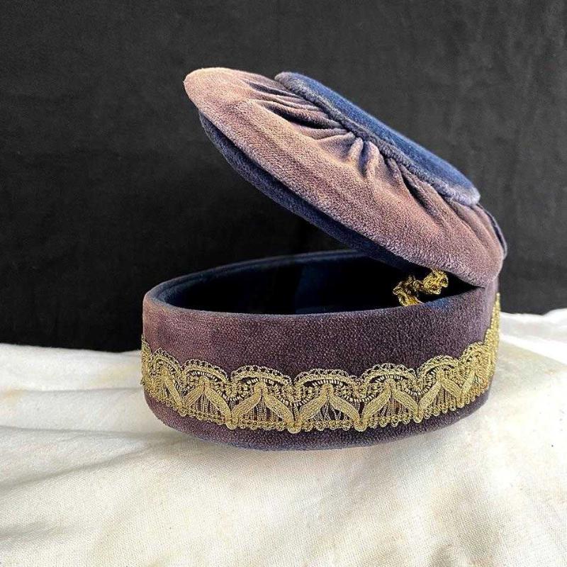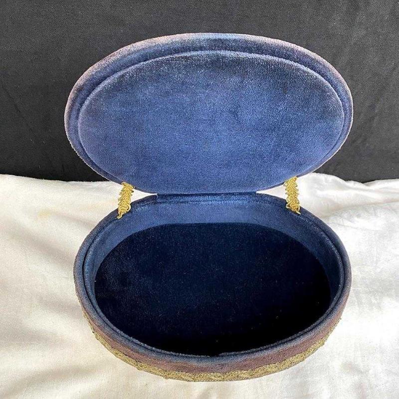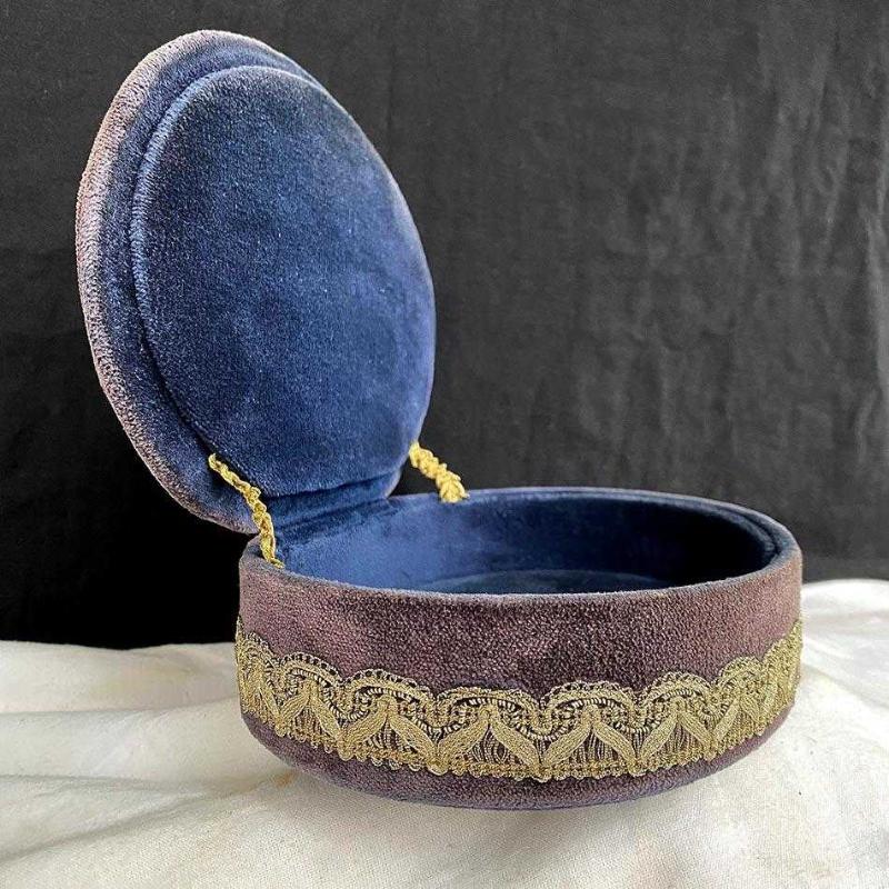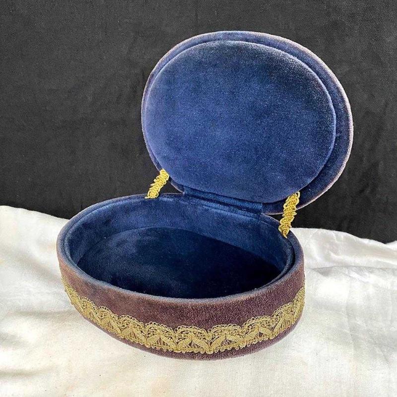 1960'ların İstanbul'undan el üretimi bu zarif mücevher kutusu, dönemin lüks anlayışının güzel bir örneği. Oval şekilli kutu, mor ve mürdüm tonlarında kadife kumaşla kaplanmış. İçi lacivert kadife astarlı kutunun altında pirinç ayaklar (kabara) bulunuyor. Kutunun çevresi, altın renkli el işi dantel fisto şeritle kaplanmış. Kapağın iki yanında, kapağı tutması için benzer el işi dantel şerit kemer yer alıyor. Çok zarif bir dekoratif eşya olan kutu yaşına göre iyi durumdadır. Kadife yüzeyde yer yer renk aşınmaları dışında herhangi bir sorunu, yırtık ya da eksik parçası yoktur. Tüm parçaları orijinaldir. 23x16x8 cm 370 gr