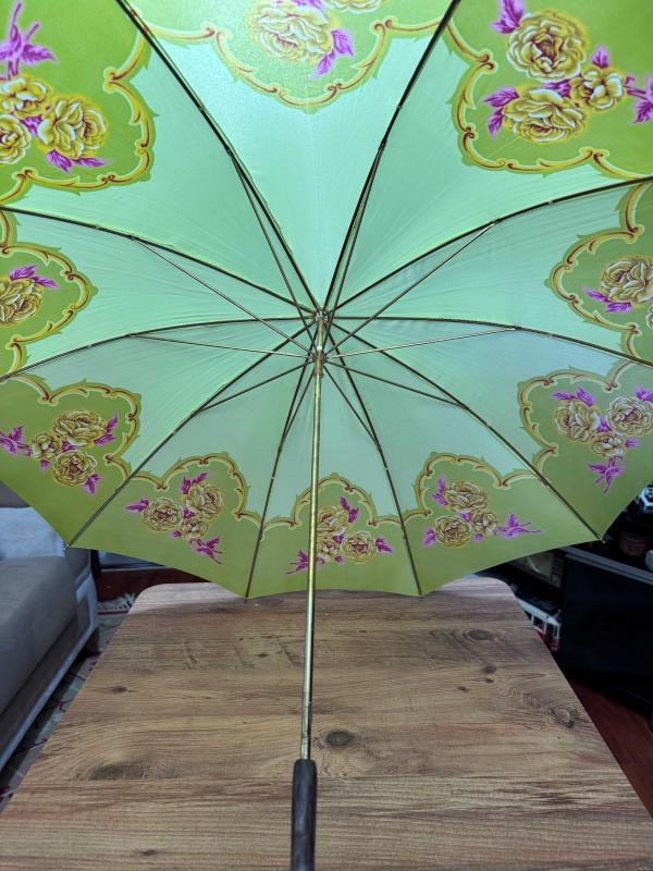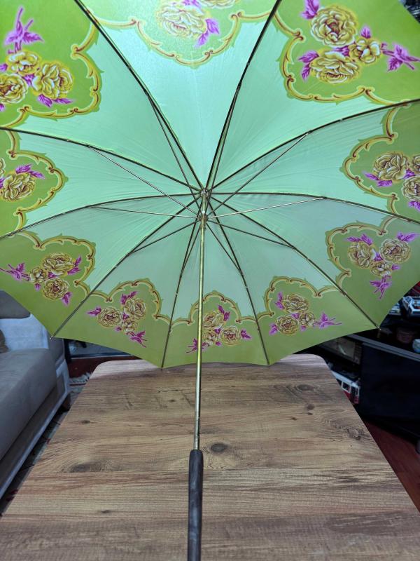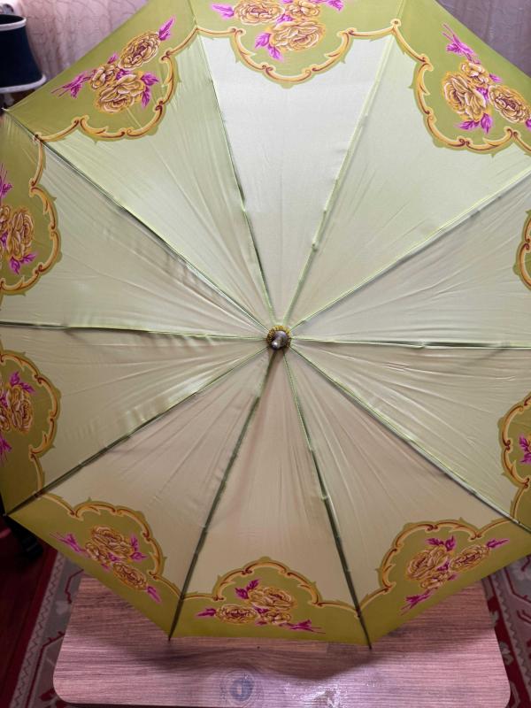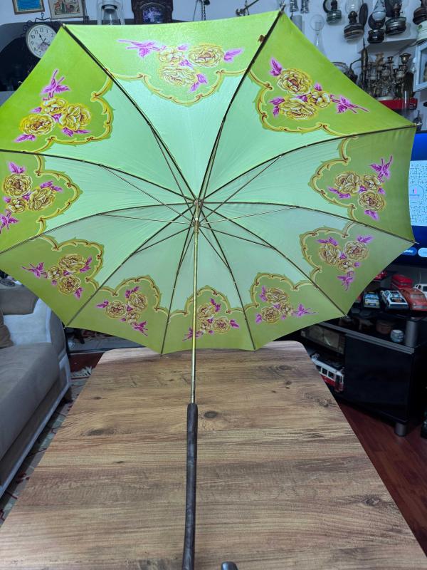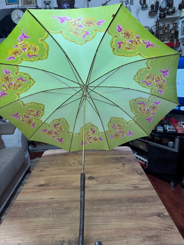 Nostaljik Tasarım Vintage Şemsiye - Tertemiz Göz alıcı fıstık yeşili rengi ve zarif gül desenleriyle koleksiyonluk bir parça. Hem günlük kullanım hem de dekoratif amaçlı harika bir aksesuar. başlıklı antika/koleksiyon objesi Osmanlı menşe’lidir. Objenin ait olduğu dönem bilinmeketedir.