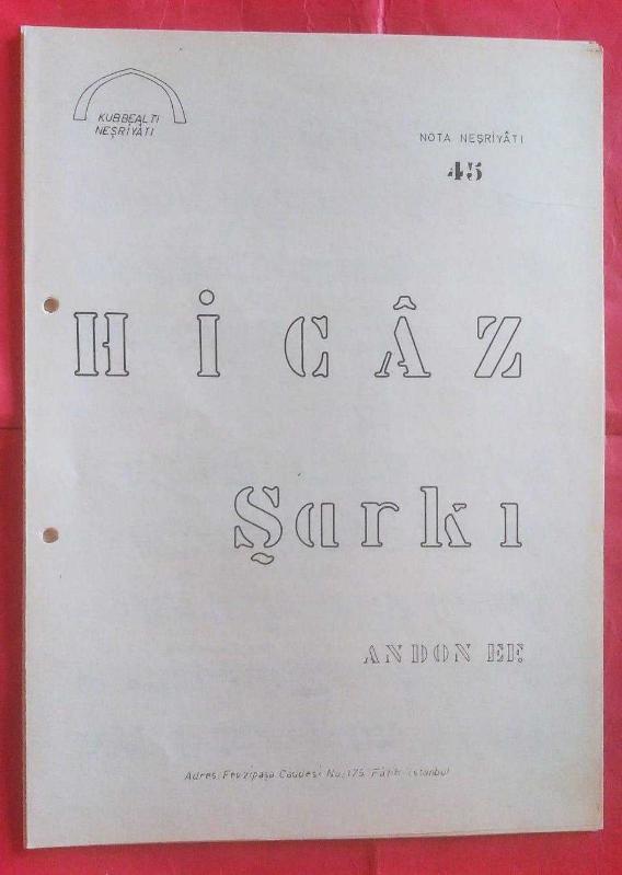 Kitap Kubbealtı Neşriyatı tarafından yayınlanmıştır. 4 sayfadır. Nota: Hicaz Şarkı (Andon Efendi) adlı eser Türkçe dilindedir.