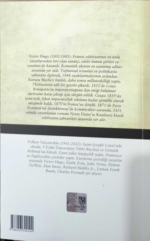 Victor Hugo (1802-1885): Fransız edebiyatının en ünlü yazarlarından biri olan sanatçı, edebi ününü şiirleri ve oyunları ile kazandı. Romantik akımın en tanınmış adları arasında yer aldı. Toplumsal sorunlar ve politikayla yakından ilgilendi, 1848 ayaklanmalarının ardından Kurucu Meclis'e katıldı, daha sonra milletvekilliği yaptı, l'Evénement adlı bir gazete çıkardı. 1852'de Louis Bonaparte'ın imparatorluğunu ilan ettiği hükümet darbesine karşı çıktığı için sürgün edildi. Cezası 1859'da sona erdi, fakat imparatorluk yıkılana kadar gönüllü olarak sürgünde kaldı, 1870'de Fransa'ya döndü. 1871'de Paris Komünü'nü desteklemese de komüncüleri savundu. 1831 yılında yayımlanan romanı Notre Dame'ın Kamburu klasik edebiyatın şaheserleri arasında yer alır. (Tanıtım Bülteninden)