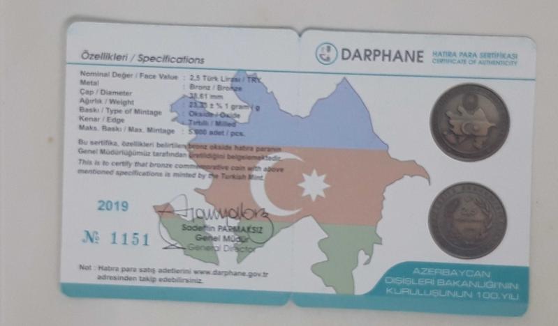 Nümismatik - Azerbaycan Dışişleri Bakanlığının 100. Yılı Bronz Hatıra Para Darphane 2019 Sertifikalı Aldığınız ürün indirimli olarak Aras Kargo ile gönderilecektir.