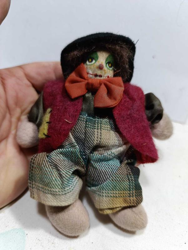 O12---SERAMİK GÖVDELİ PALYAÇO BEZ BEBEK başlıklı antika/koleksiyon objesinin menşei belirtilmemiştir. Objenin ait olduğu dönem bilinmeketedir.