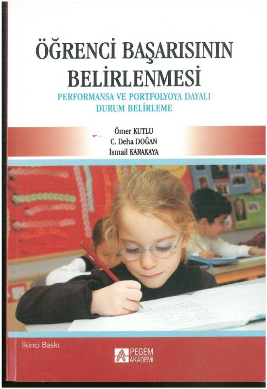 ÖĞRENCİ BAŞARISININ BELİRLENMESİ Performansa ve Portfolyoya Dayalı Durum Belirleme 2.BASKI - 2009, ÖMER KUTLU-C.D.DOĞAN-İ.KARAKAYA tarafından kaleme alınmıştır. Kitap 2009 yılında PEGEM A YAYINCILIK tarafından [ANKARA] yayınlanmıştır. Satışta olan kitap, yayınevinin 2. baskısıdır. 213 sayfadır. ÖĞRENCİ BAŞARISININ BELİRLENMESİ Performansa ve Portfolyoya Dayalı Durum Belirleme 2.BASKI - 2009 adlı eser Türkçe dilindedir.