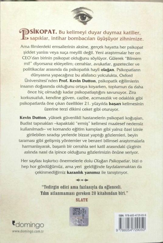 PSİKOPAT. Bu kelimeyi duyar duymaz katiller, sapıklar, intihar bombacıları üşüşüyor zihnimize. Ama filmlerdeki emsallerinin aksine, gerçek hayatta her psikopat şiddet yanlısı veya suça meyilli değil. Yeni araştırmalar her on CEOdan birinin psikopat olduğunu söylüyor. Gülerek Bilmem mi! diyorsanız ekleyelim; cerrahlar, avukatlar, gazeteciler ve politikacılar arasında da psikopatlık hayli olağan. Psikopatların dünyasına yapacağınız bu afallatıcı yolculukta, Oxford Üniversitesinden Prof. Kevin Dutton, psikopatik eğilimlerin insanın doğasında olduğunu ortaya koyarken, toplumun da daha önce hiç olmadığı kadar psikopatlaştığını savunuyor. Zira korkusuzluk, kendine güven, cazibe, acımasızlık ve odaklılık gibi psikopatlarda öne çıkan özellikler 21. yüzyılda başarı kelimesinin üzerine terzinin diktiği ceket gibi oturuyor. Kevin Dutton, yüksek güvenlikli hastanelerin psikopati koğuşları, Budist tapınakları -kapaktaki ermiş kelimesi maalesef nedensiz kullanılmadı- ve komando eğitim kampları gibi yalnız özel izinle girilebilen sıra dışı yerlerde sayesinde bizzat yaptığı gözlemleri, beyin taraması gibi gelişmiş yöntemler ve benzeri bilimsel araştırmalarla harmanlayarak, başarılı bir cerrahla seri katil arasındaki çizginin aslında nasıl da ipince olduğunu gözlerimizin önüne seriyor. Her sayfası kışkırtıcı önermelerle dolu Olağan Psikopatlar, bizi o hep hor gördüğümüz, ama yeri geldiğinde faydalanmaktan da çekinmediğimiz karanlık yanımız ile tanıştırıyor. Tedirgin edici ama fazlasıyla da eğlenceli. 2012nin atlanmaması gereken 20 kitabından biri. -Slate