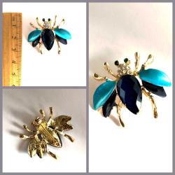 OMENİV'DEN VİNTAGE STİL MAVİ BÖCEK KELEBEK BROŞ İĞNE SEDEFLİ KAPLAMA KRİSTAL DETAYLARA DİKKAT