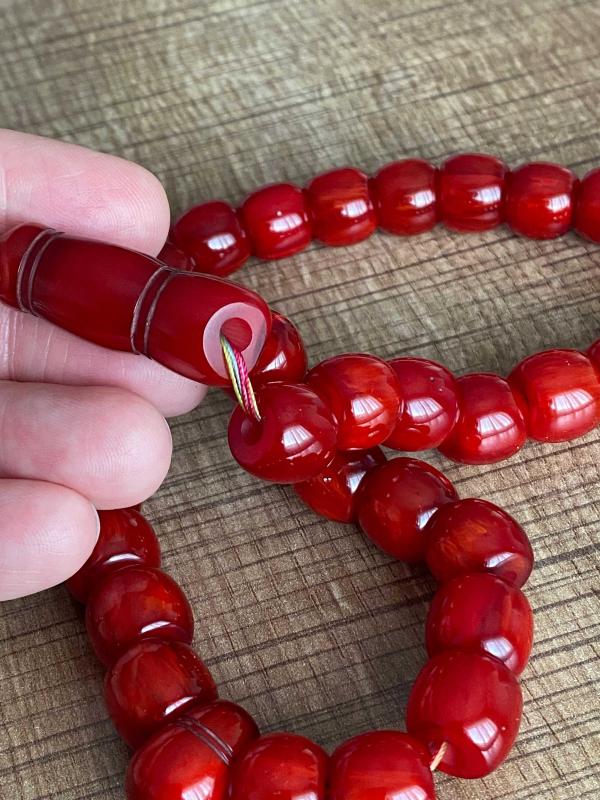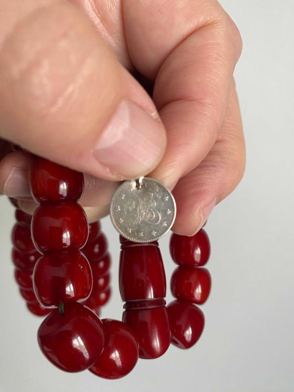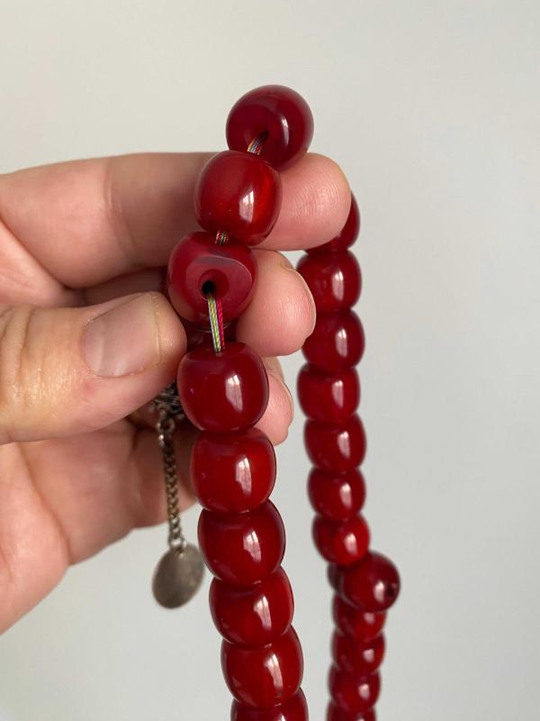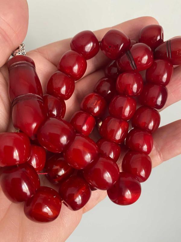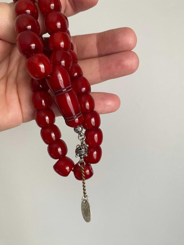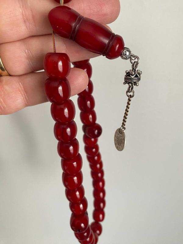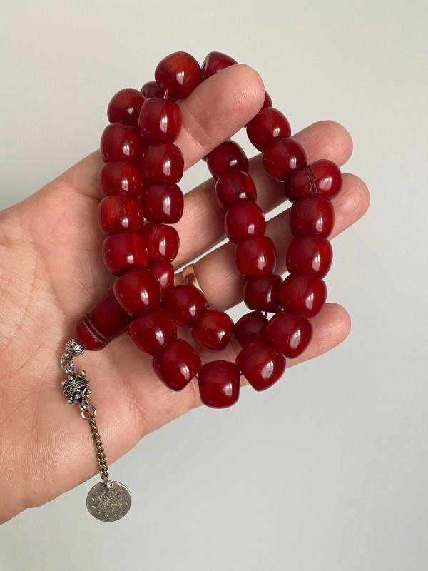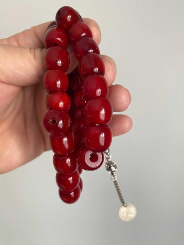 Orijinal Afgan sıkma kehribar tespih. Yarım asırdan daha eski. Ucunda Osmanlı gümüş para püskül. Hareleri fotoğrafta görünür, çekimi sesi sert ve dolgun. İri habbeli. İmamesi çift delikli.