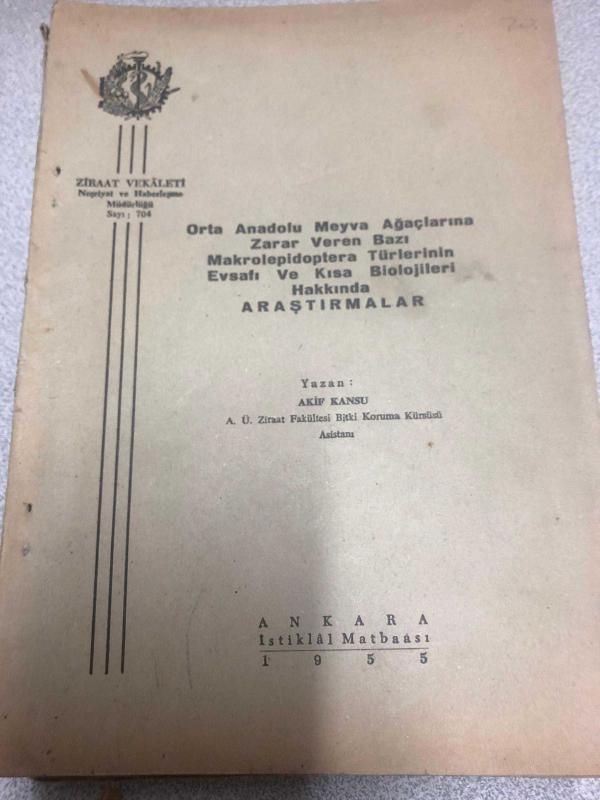 MM3990 ORTA ANADOLU MEYVA AĞAÇLARINA ZARAR VEREN BAZI MAKROLEPİDOPTERA TÜRLERİNİN EVSAFI VE KISA BİOLOJİLERİ HAKKINDA ARAŞTIRMALAR YAZAN:AKİF KANSU ZİRAAT VEKALETİ 1955 204 (16*24 cm ebadında) KONDİSYONU İYİ