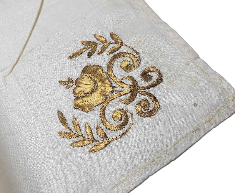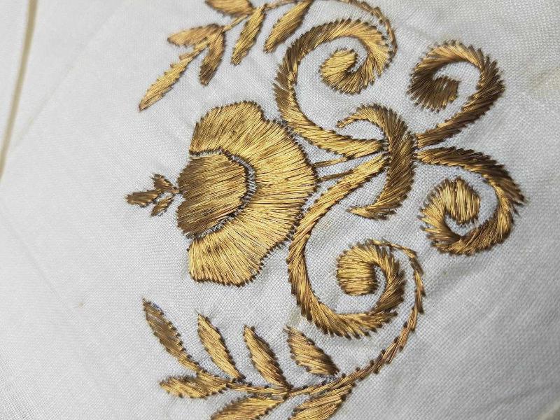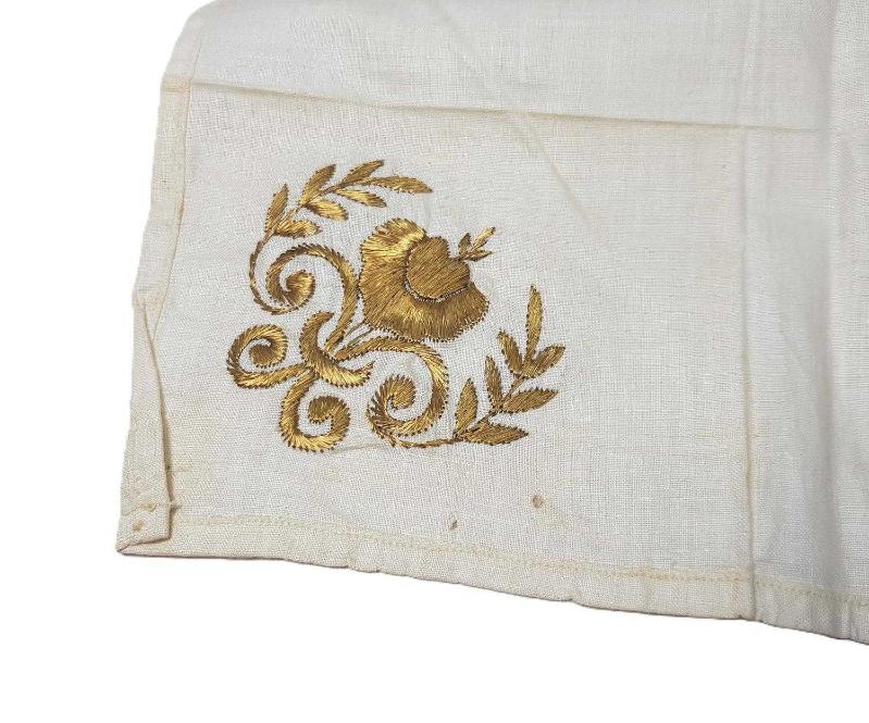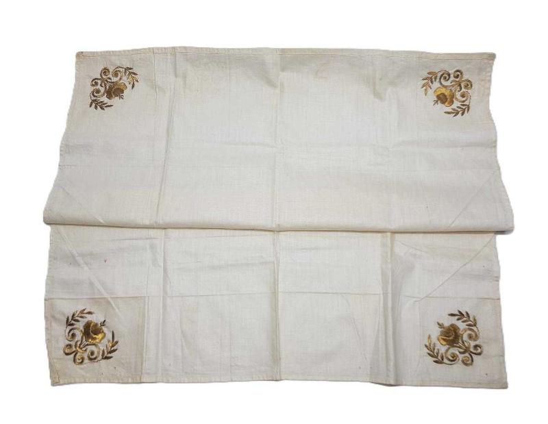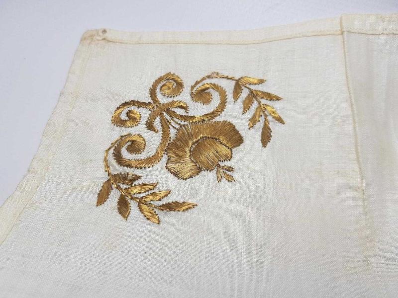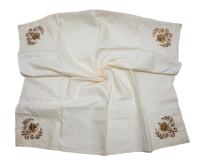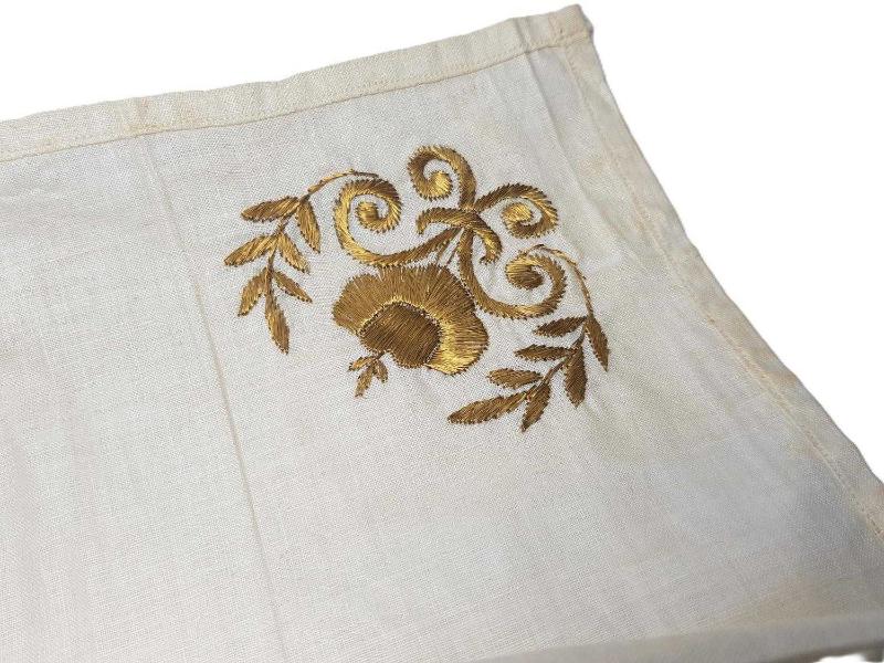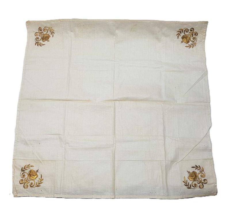 OSMANLI DÖNEMİ DÖRT KÖŞESİ ALTIN SIRMA İPLERLE İŞLENMİŞ ÇİÇEK DESENLERİYLE SÜSLÜ KETEN İPEK ÇEVRE ULAMA ÖRTÜ. EBAT: 61 X 57 CM