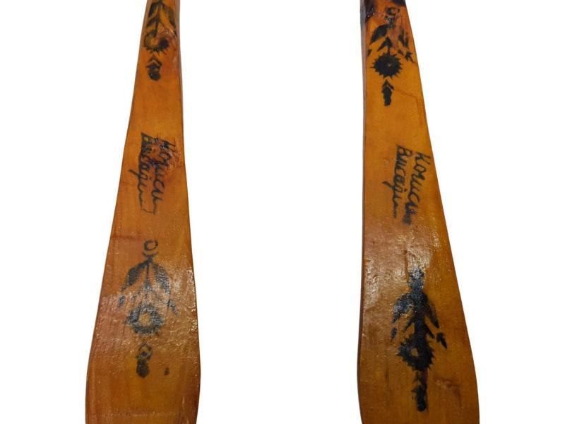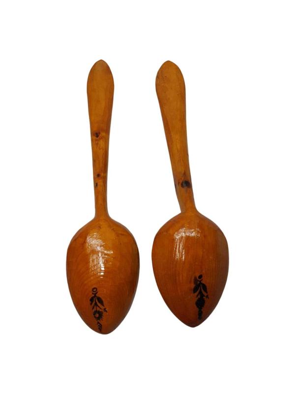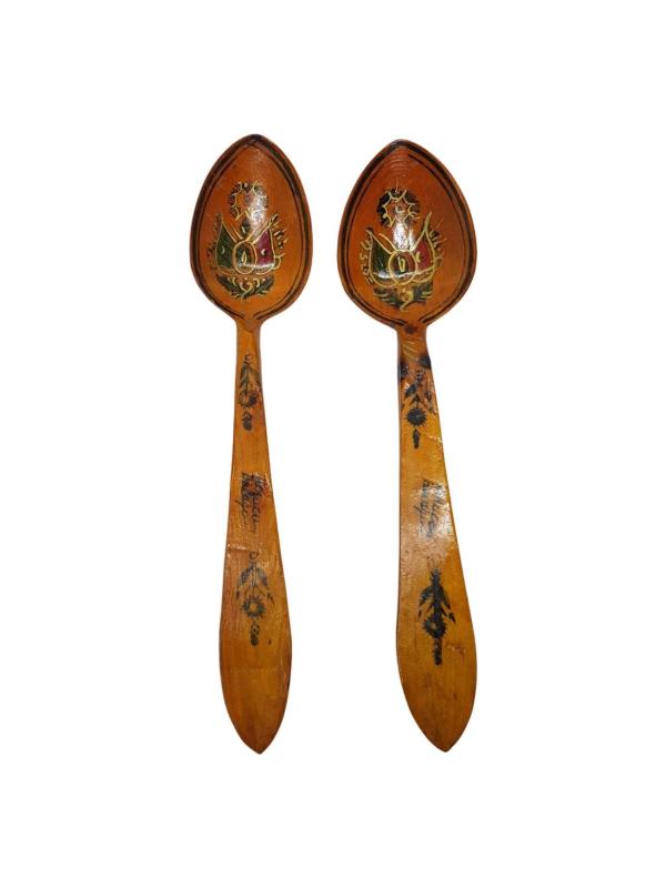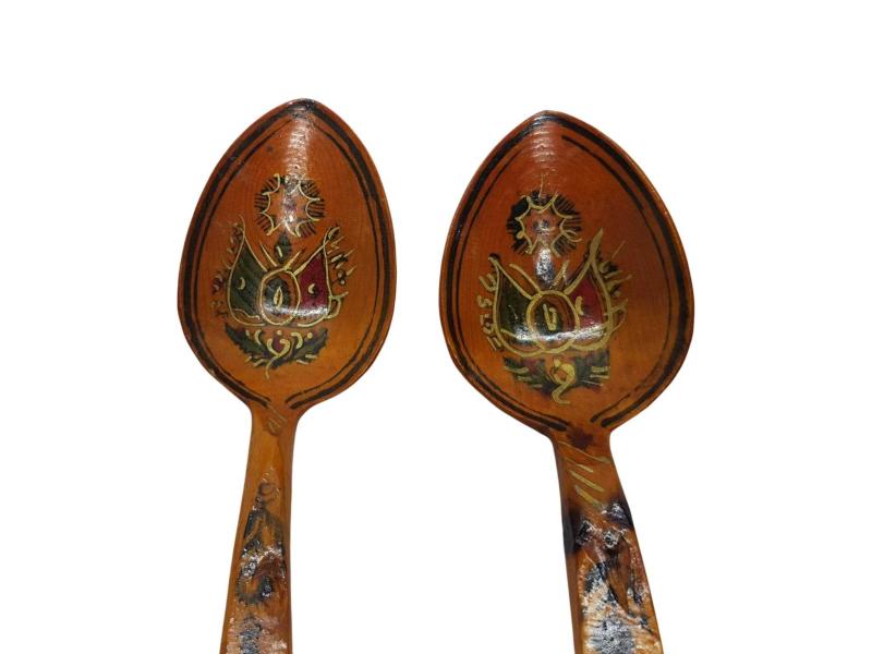 1940-1950'LERDEN AHŞAPTAN MAMÜL, ÜZERİ EL BOYAMA OSMANLI DEVLET ARMASI İLE SÜSLÜ BİR ÇİFT TAHTA KAŞIK. BALIKESİR'İN İVRİNDİ İLÇESİ'NİN KORUCU BELDESİ'NDE YAPILAN BU KAŞIKLARIN NE YAZIK Kİ GÜNÜMÜZDE USTALARI KALMAMIŞTIR. UZUNLUK: 23 CM