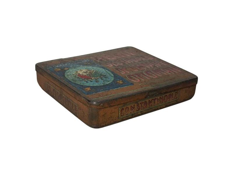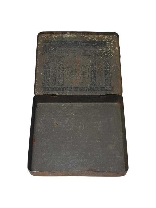 OSMANLI DÖNEMİ ÜZERİ OSMANLICA VE FRANSIZCA YAZILI, DEVLET ARMALI TENEKE SİGARA KUTUSU. EBAT: 8,7 X 8 X 1,8 CM