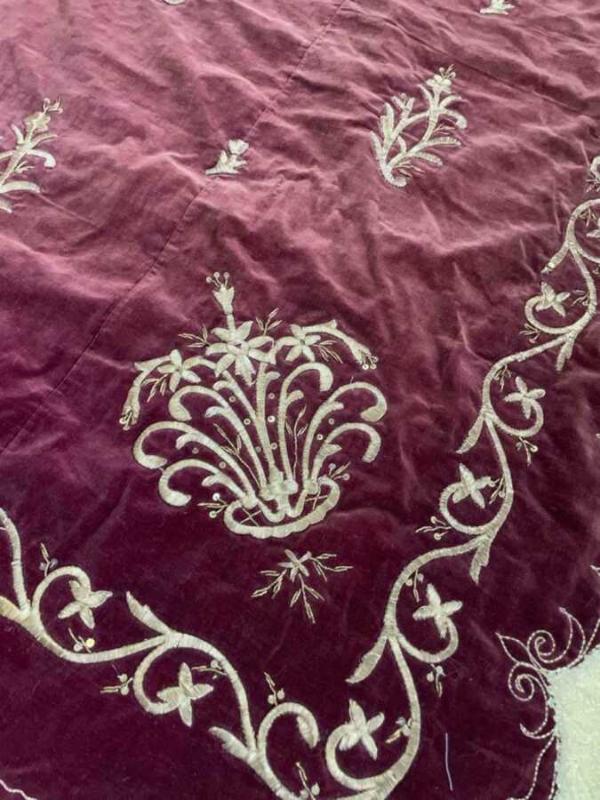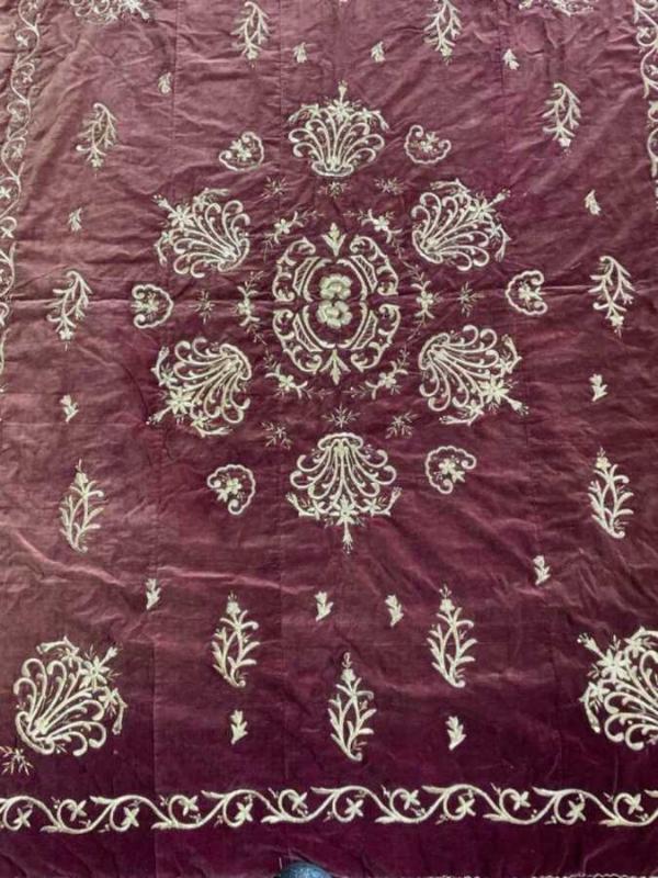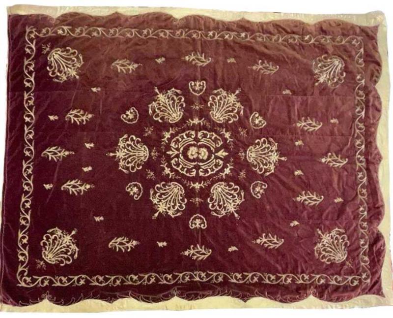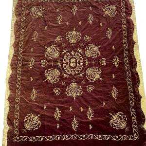 OSMANLI DÖNEMİ ALTINSIRMALI BİNDALLI İŞLEMELİ KADİFE YATAK ÖRTÜSÜ MÜZELİK BİR ANTİKA YAŞI 150 YIL CİVARI ZEMİNİ PATLICAN MORU KADİFE HALİ İLE UZUN YILLAR İÇİNDE KADİFESİNDE KISMEN HAFİF SOLMALAR VARDIR HARİKA İŞLERİ DİRİ,SAĞLAM VE YATIKTIR DELİK,YIRTIK YOKTUR SONRADAN,ARKASINA ELYAF ASTAR, KENARLARINA ALTIN LAME KUMAŞ DİKİLMİŞ SAĞLAM VE TEMİZDİR DETAYLARI RESİMLERDEDİR YAKLAŞIK EBAT 145cmx190cm