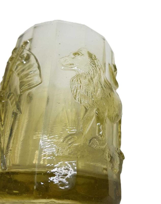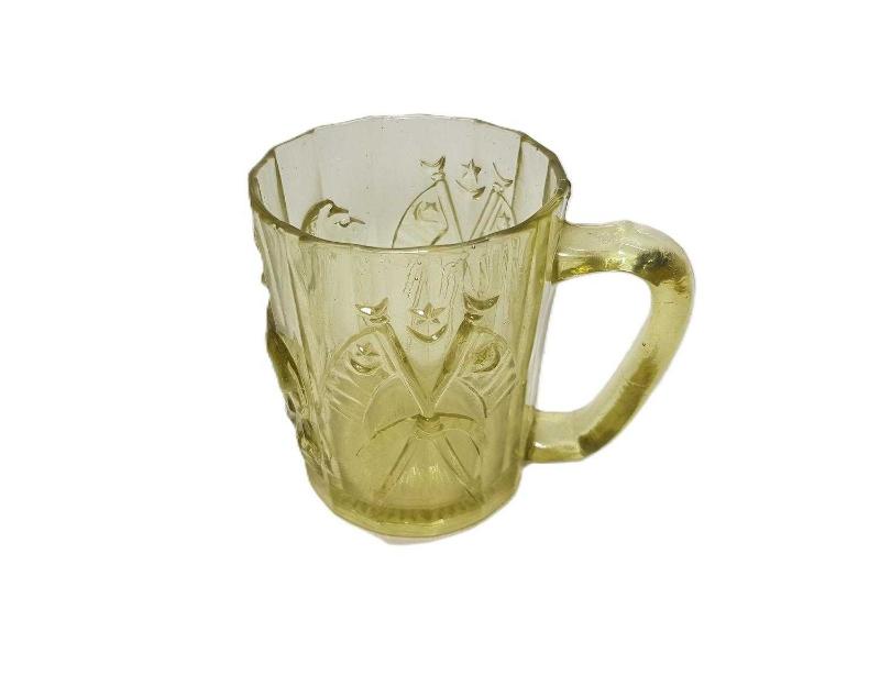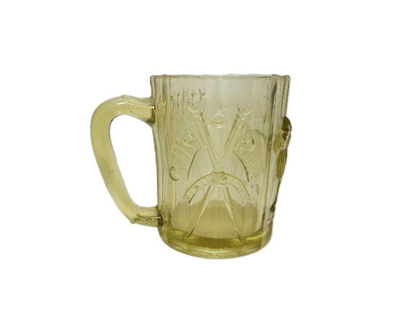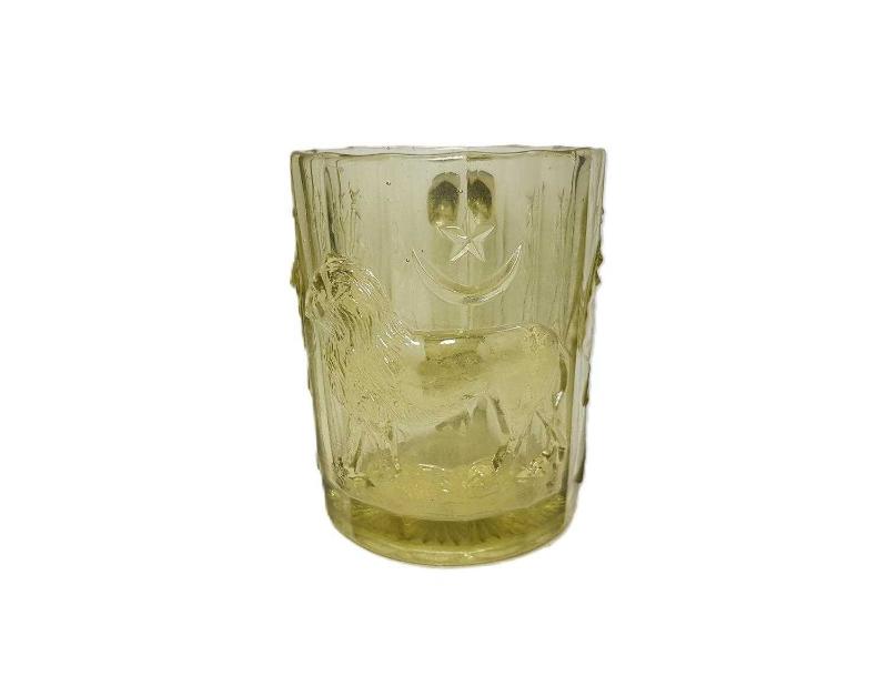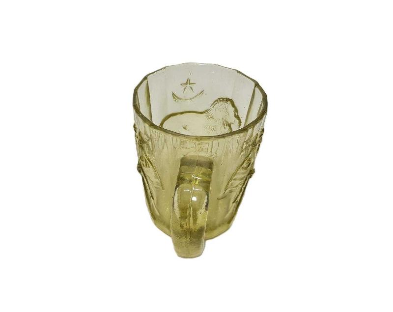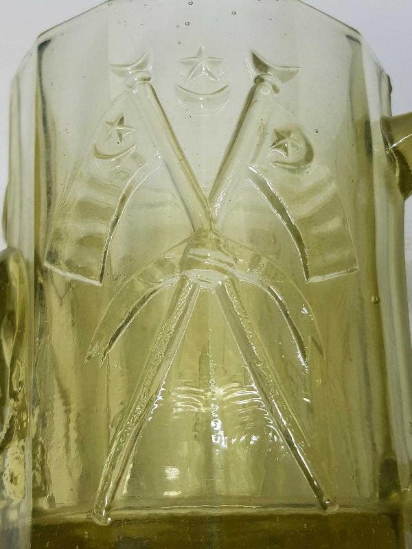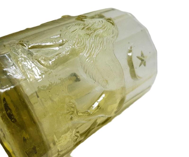 OSMANLI DÖNEMİ LION (ARSLAN) BİRA BARDAĞI. MEŞRUTİYET BAYRAKLARI, ASLAN VE AY YILDIZ KABARTMA DESENLİDİR. NADİR BULUNMAKTADIR. YÜKSEK KONDİSYONDADIR, KIRIK, ATIK VE ÇATLAK YOKTUR. BAL RENGİ OLDUKÇA NADİRDİR. YÜKSEKLİK: 13 CM