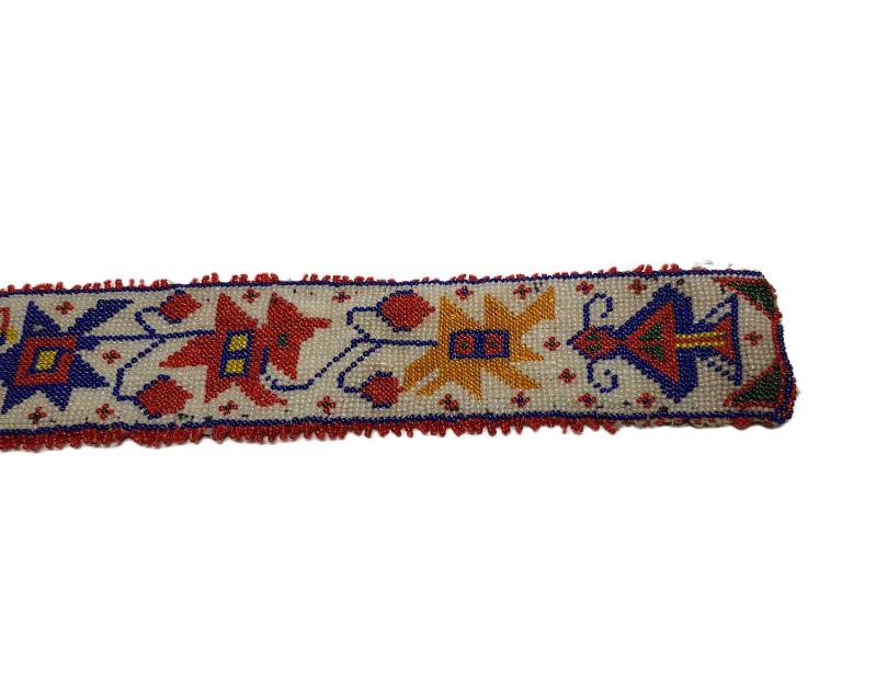 OSMANLI DÖNEMİ, EL YAPIMI, ÜZERİ FLORAL VE GEROMETRİK DESENLERLE SÜSLÜ, ORTA KISMINDA AY YILDIZLI BAYRAK İŞLEMESİ DE BULUNAN BONCUK İŞLEME KEMER. UZUNLUK: 76,5 CM