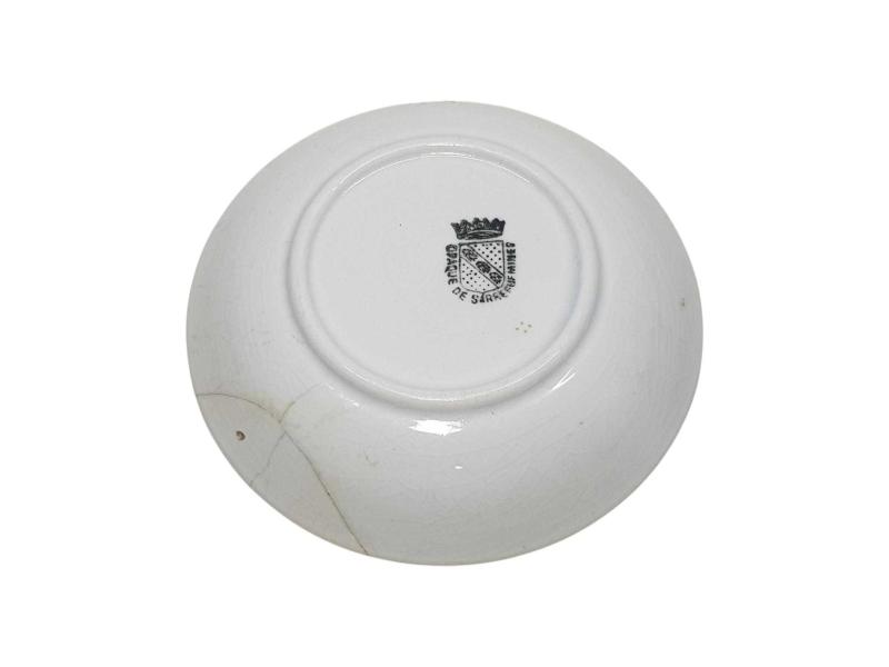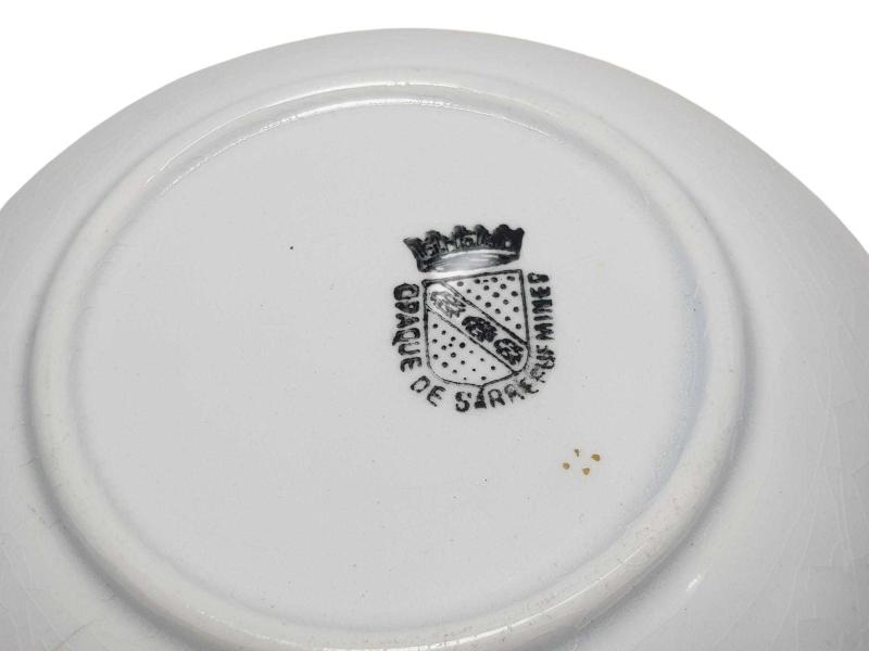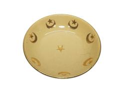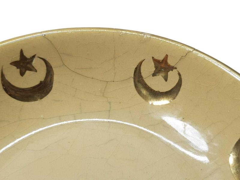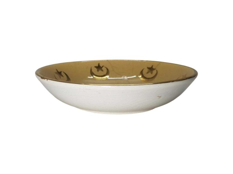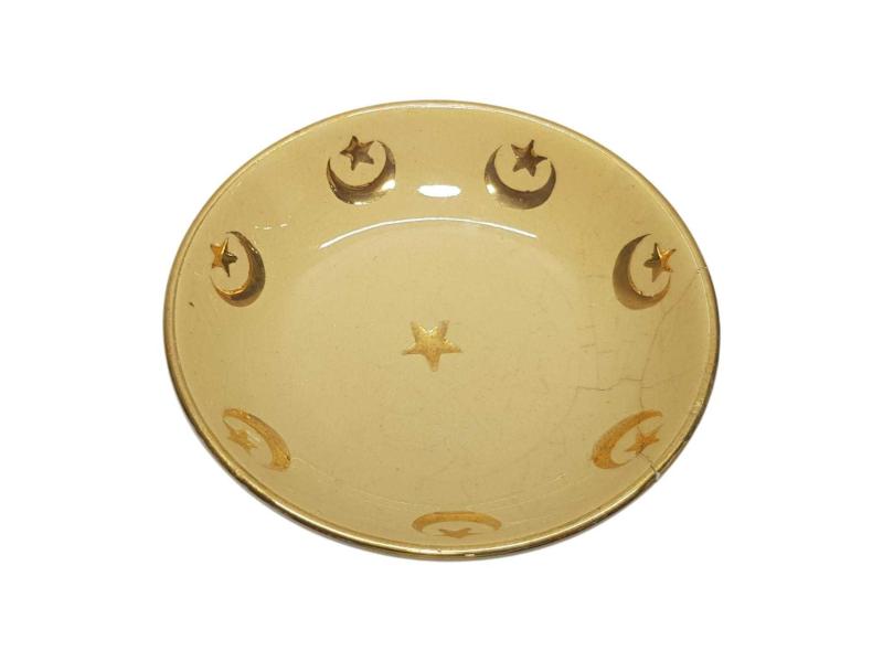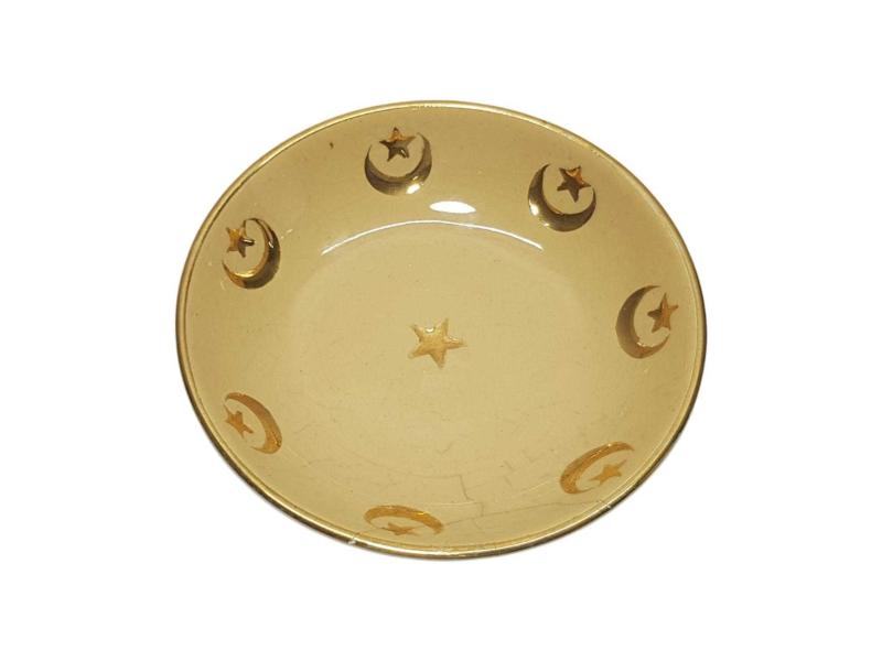 SARREGUAMINES MARKA, ÜZERİ AY YILDIZLARLA SÜSLÜ VE ALTIN YALDIZLI PORSELEN TABAK. UFAK BİR YERİNDE TAMİR VAR. ÇAP: 12 CM YÜKSEKLİK: 2,7 CM