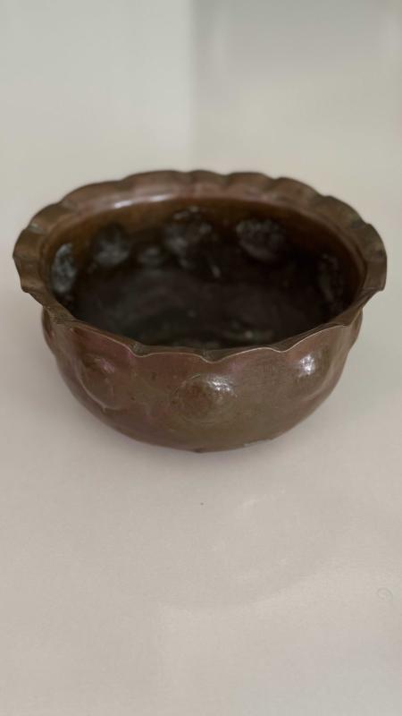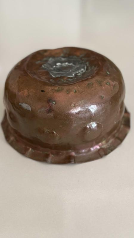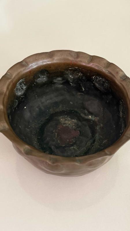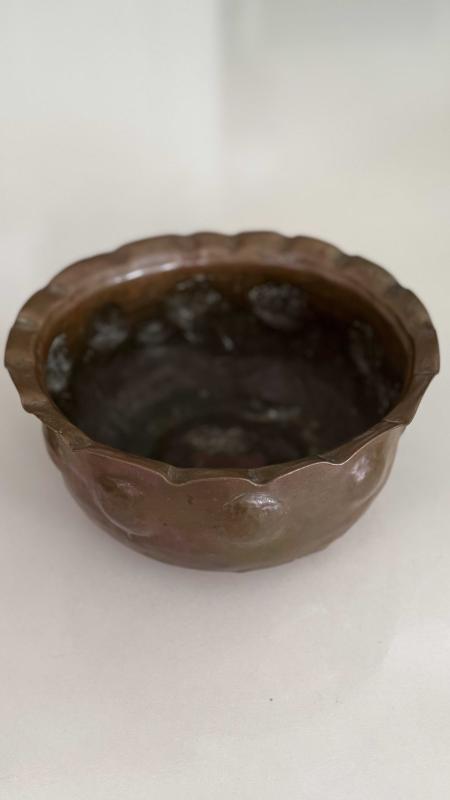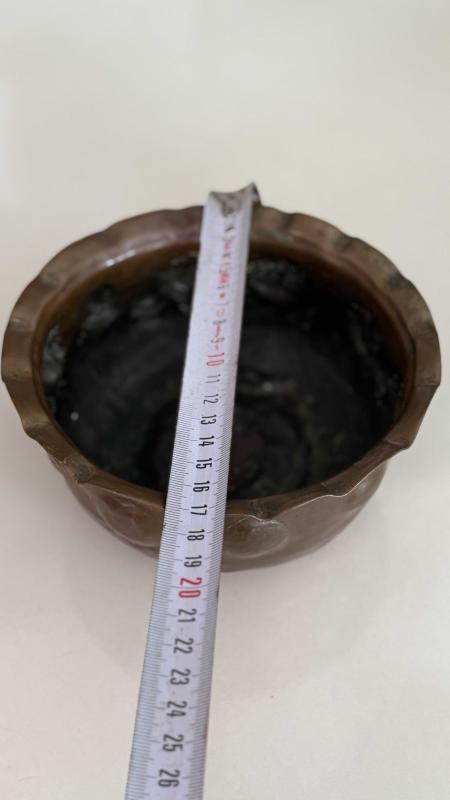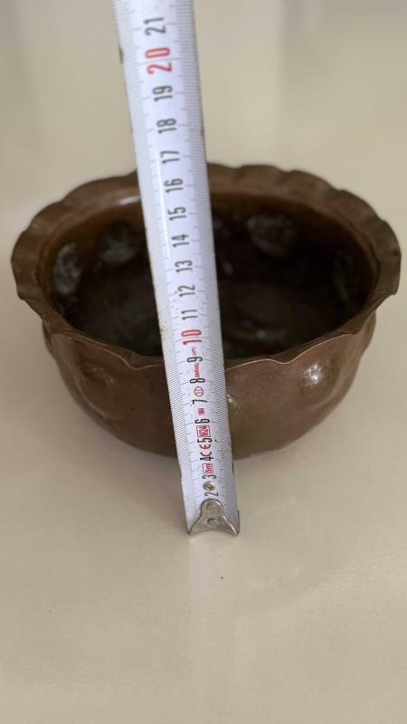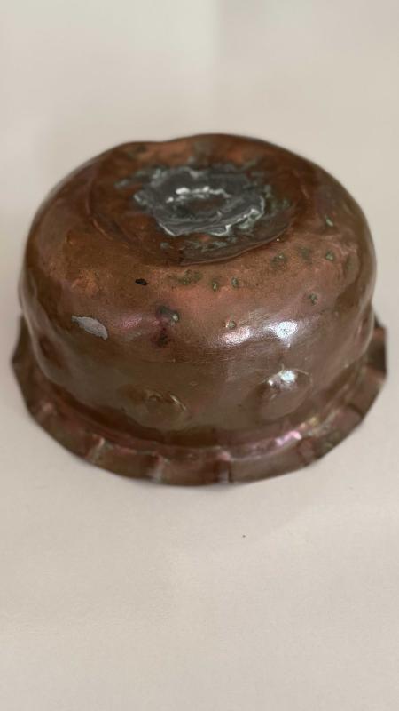 Çekiç sövme Bombe formu verilmiş Osmanlı dönemi şifa tası bakır kusursuz ağız kısmı dilim tırnaklı formu verilmiş • Alt kısmında yoğun oksidasyon (yeşil patina) mevcut etli kalın bakırdan koleksiyonluk bir eser