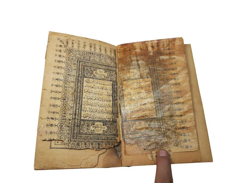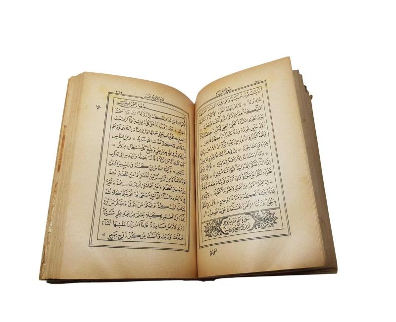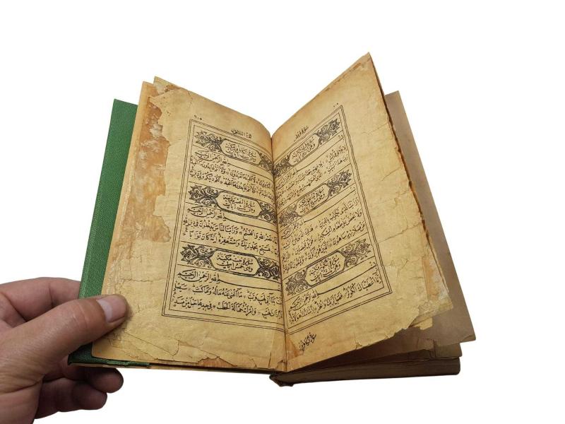 OSMANLI DÖNEMİ HATTAT HAFIZ OSMAN EFENDİ VE HAFIZ MUSTAFA EFENDİ (1313 - 1897 MÜHÜRLÜ) HATTI BASKI KURAN. CİLDİ SAĞLAM OLUP, İLK VE SON SAYFALARDA BANTLA TAMİR YAPILMIŞ. EBAT: 19 X 13 CM 611 SAYFA