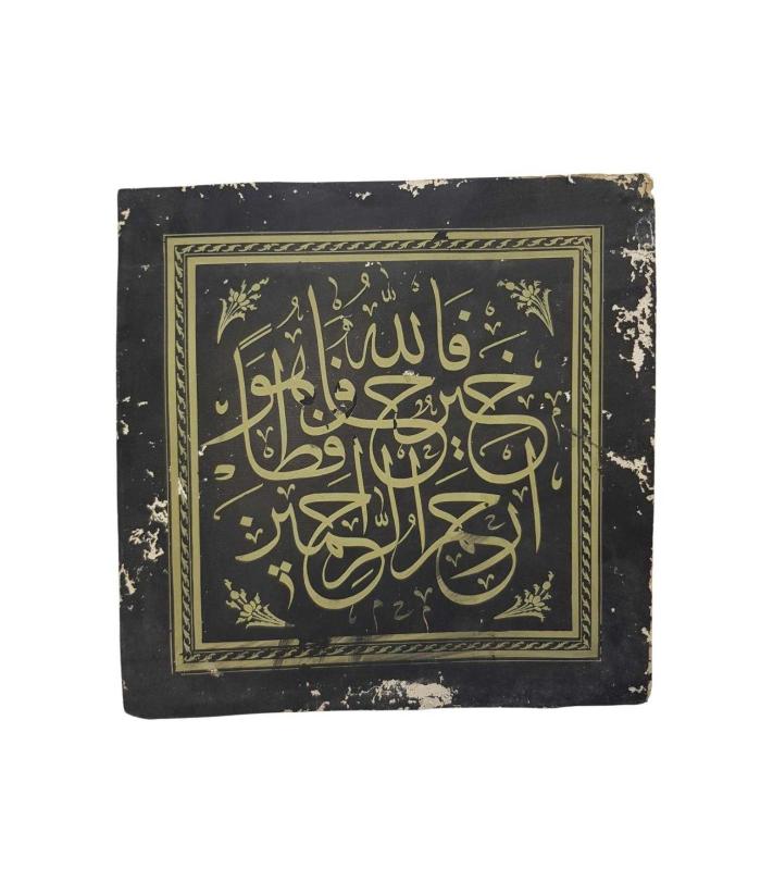 OSMANLI DÖNEMİ ÜNLÜ BİR HATTATA AİT MUKAVVA ÜZERİ BASKI HAT LEVHA. "FALLAHU HAYRUN HAFİZUN VE HUVER-RAHMAN-UR-RAHİM" EBAT: 34 X 34 CM