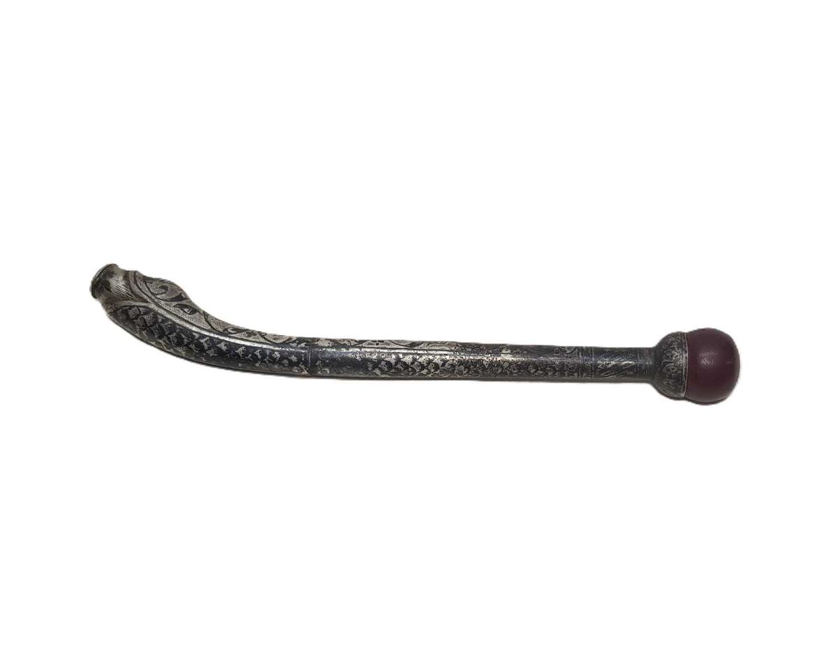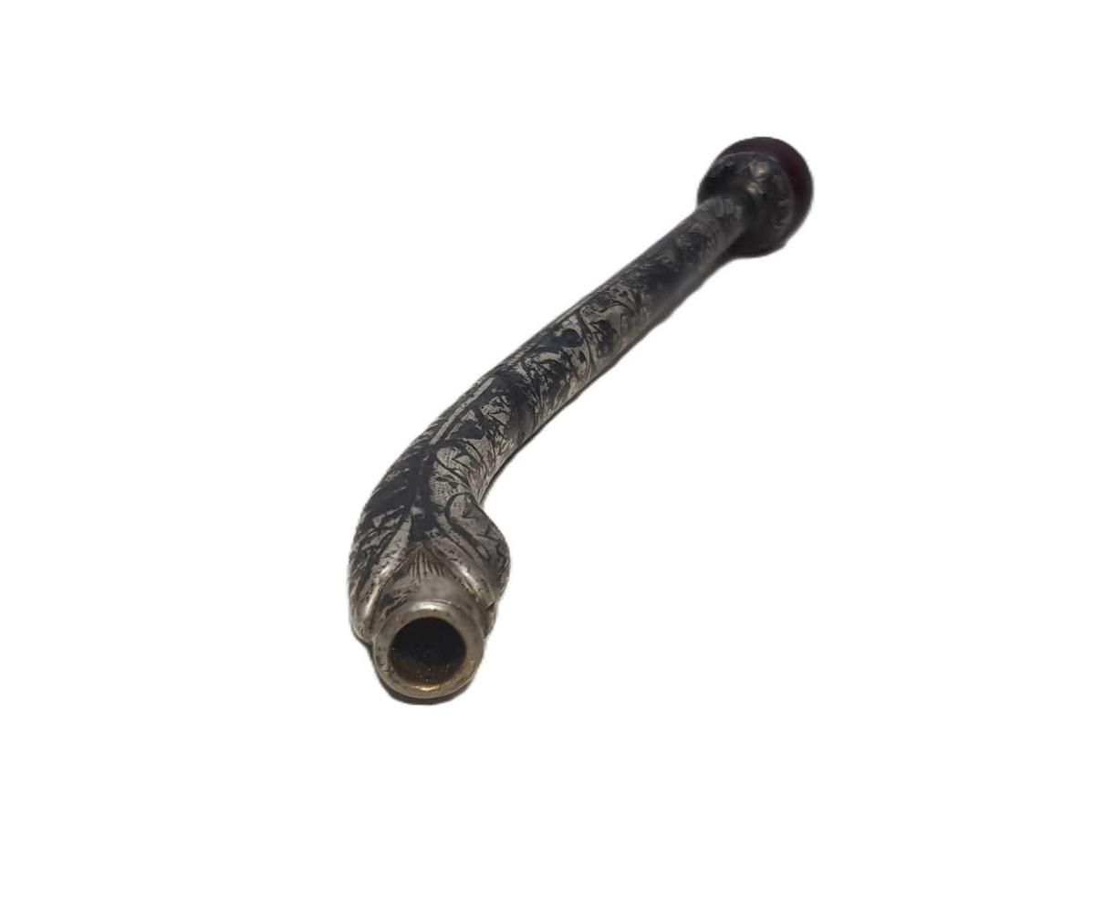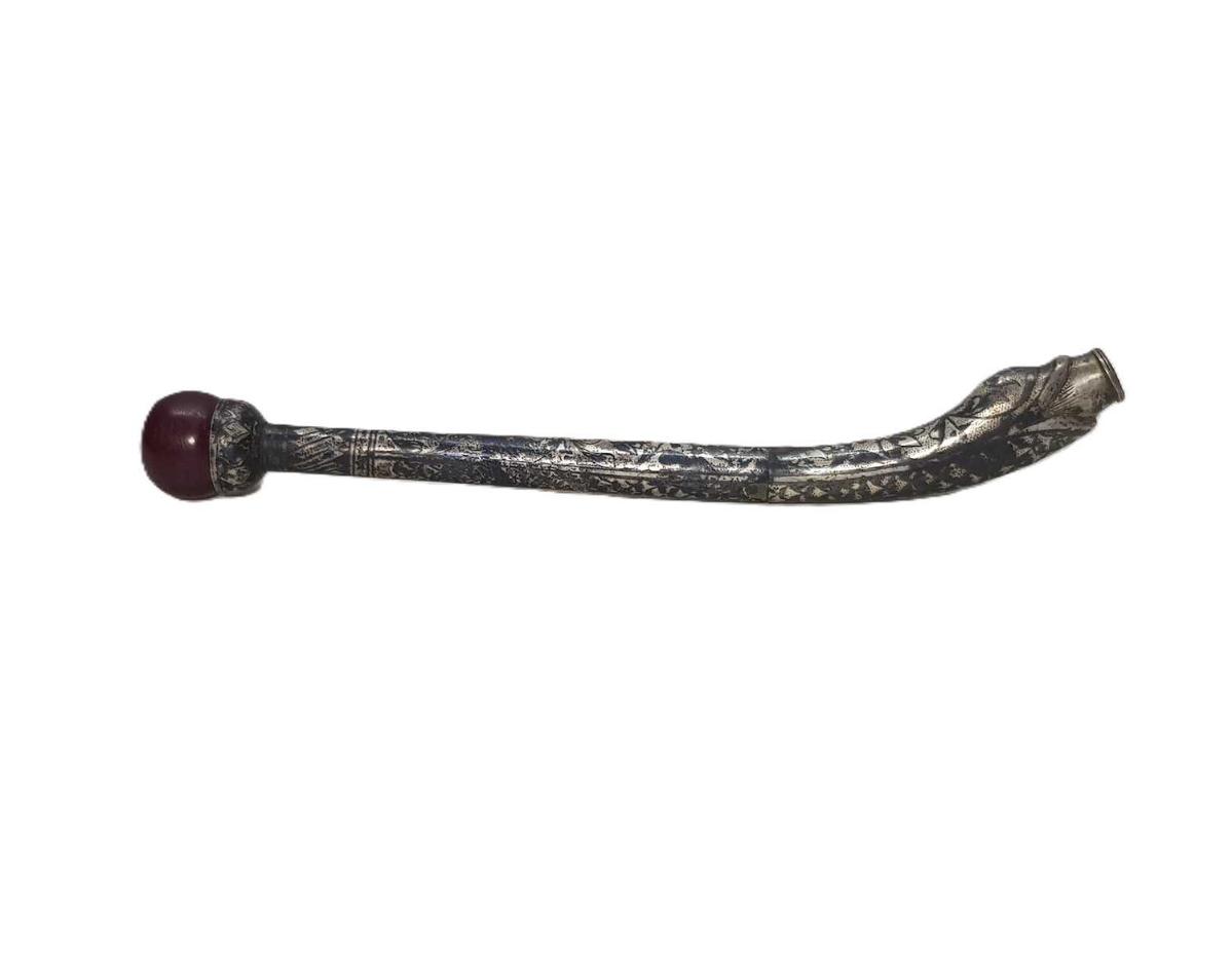 OSMANLI DÖNEMİ, EMZİK KISMI SIKMA KEHRİBARDAN MAMÜL, YILAN FORMLU VE ÜZERİ SAVATLI FARKLI FORMDA GÜMÜŞ SİGARA AĞIZLIĞI UZUNLUK: 17,2 CM AĞIRLIK: 46,7 GRAM