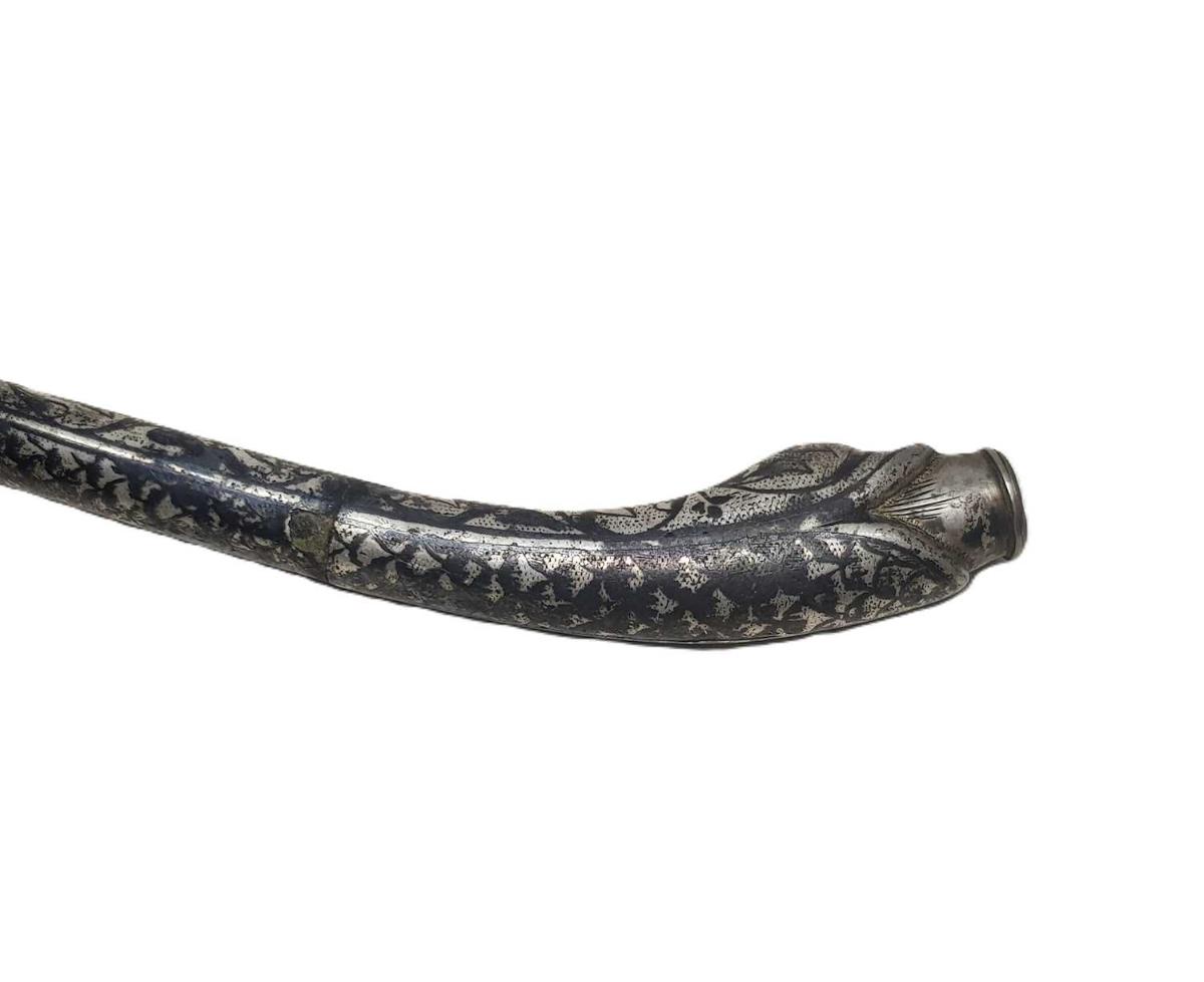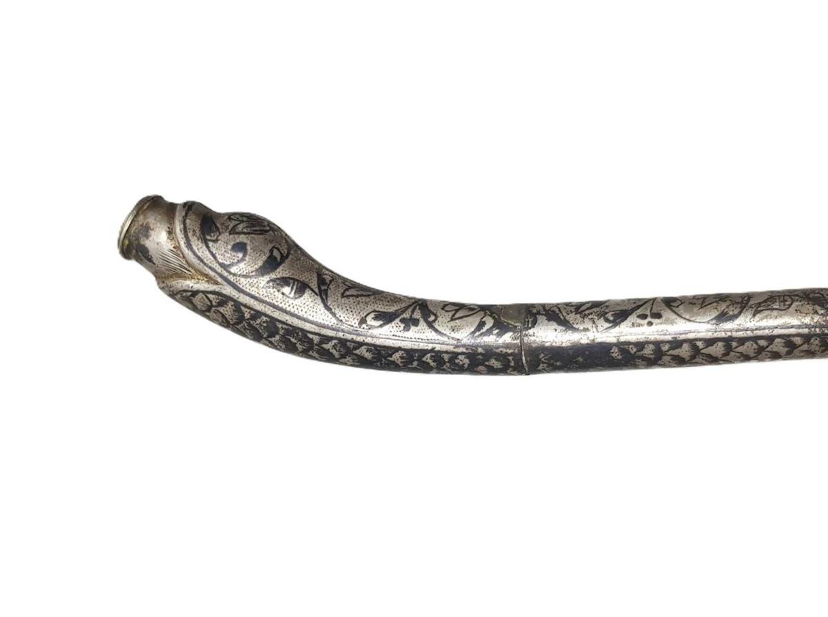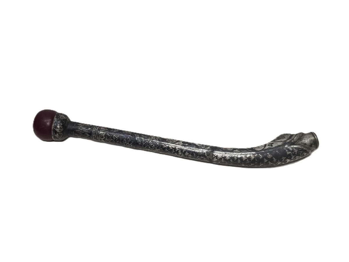 OSMANLI DÖNEMİ, EMZİK KISMI SIKMA KEHRİBARDAN MAMÜL, YILAN FORMLU VE ÜZERİ SAVATLI FARKLI FORMDA GÜMÜŞ SİGARA AĞIZLIĞI UZUNLUK: 17,2 CM AĞIRLIK: 46,7 GRAM