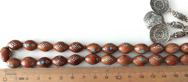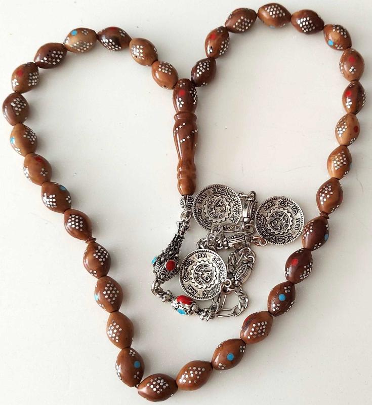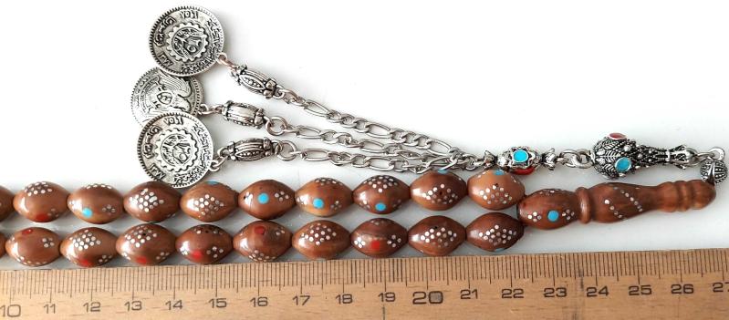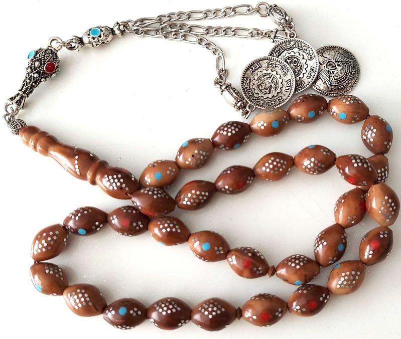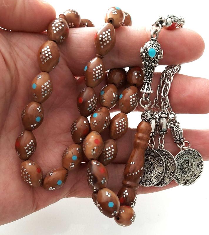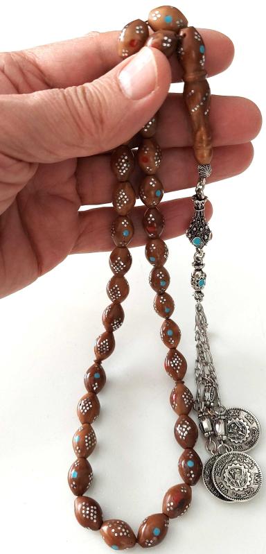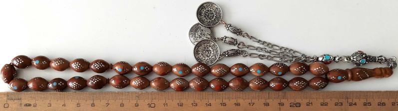 OSMANLI DÖNEMİ MALZEMEDEN YAPILMA GÜMÜŞ KAKMA VE MERCAN İŞLEMELİ AÇIK KAHVERENGİ MÜTHİŞ İŞÇİLİKLİ MUHTEŞEM GÜMÜŞ PÜSKÜLLÜ KUKA TESPİHTİR. PÜSKÜLÜN ZİNCİRİ PİRİNÇ DİĞER AKSAMLARI GÜMÜŞTÜR. ORİJİNALLİK TESTİ YAPILMIŞTIR. İLERİDE BULUNMASI VEYA ALINMASI ÇOK ZOR OLACAK TESPİHLERDENDİR. MALZEMESİ OSMANLI DÖNEMDİR. YAPIMI 30-40 YILLIKTIR. TAKLİDİ TESPİHLERLE KARIŞTIRMAYINIZ. HER TÜRLÜ TETKİK VE İNCELEMESİ YAPILMIŞTIR. İMAMELİ BOYU;27CM DİR. DANE ÇAPI;0,9X1,3CM DİR. PÜSKÜL BOYU;14CM DİR. AĞIRLIĞI;51,8GRAMDIR. UYGUN FİYATLA SATIŞA SUNULMUŞTUR. DİĞER TIRI VIRI ÜRÜNLERLE KARIŞTIRMAYINIZ. RESMİNİ GÖRDÜĞÜNÜZ ÜRÜN AYNEN GÖNDERİLİR. TÜM ÜRÜNLERİMİZİ İNCELEYE BİLİRSİNİZ. SAYGILARIMIZLA.