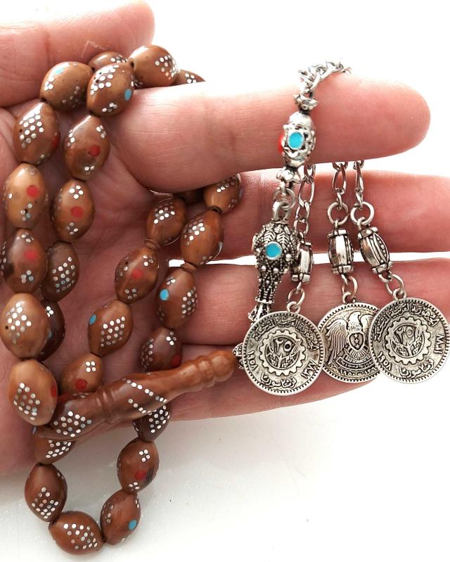 OSMANLI DÖNEMİ MALZEMEDEN YAPILMA GÜMÜŞ KAKMA VE MERCAN İŞLEMELİ AÇIK KAHVERENGİ MÜTHİŞ İŞÇİLİKLİ MUHTEŞEM GÜMÜŞ PÜSKÜLLÜ KUKA TESPİH 1Z1Q1W1 ÇOK NADİR başlıklı antika/koleksiyon objesinin menşei belirtilmemiştir. 1940 sonrası dönemine aittir.