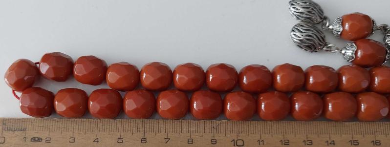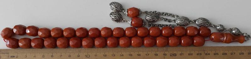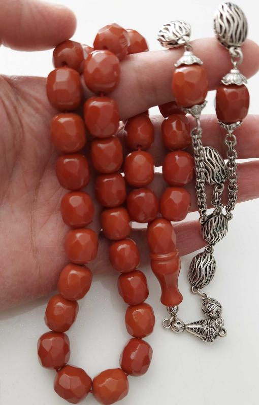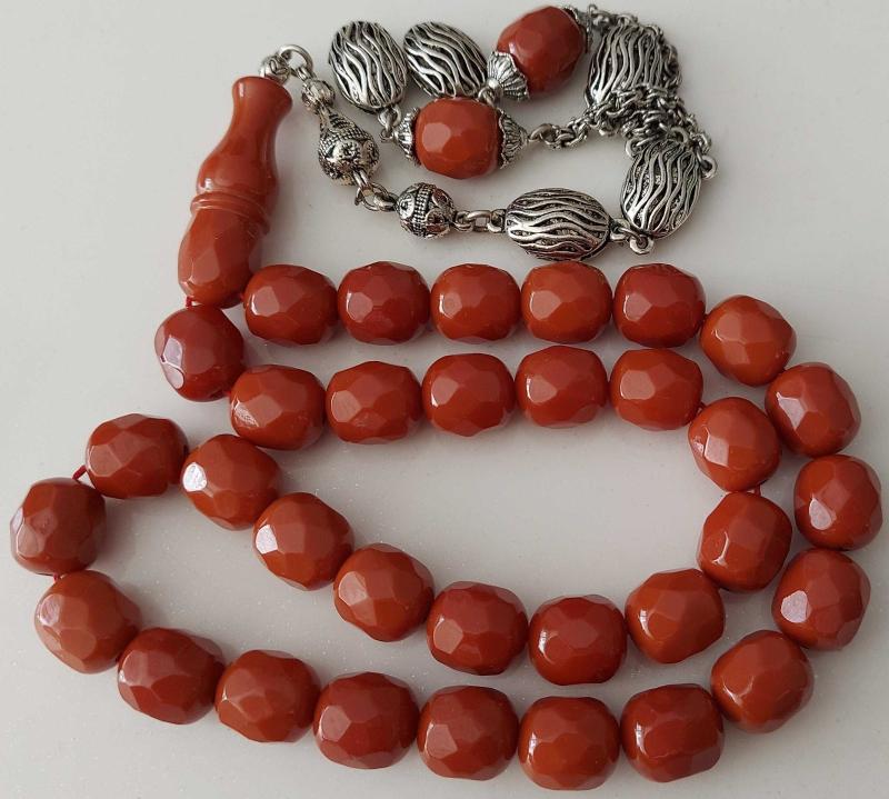 OSMANLI DÖNEMİ MALZEMEDEN YAPILMA ŞIKIR ŞIKIR HARİKA ÇOK KÖŞELİ KARANFİL RENKLİ GÜMÜŞ PÜSKÜLLÜ YEDEK DANELİ MUHTEŞEM SIKMA KEHRİBAR TESPİH 3ÇÇ1YY1 ÇOK NADİR başlıklı antika/koleksiyon objesinin menşei belirtilmemiştir. 1900-1949 arası dönemine aittir.