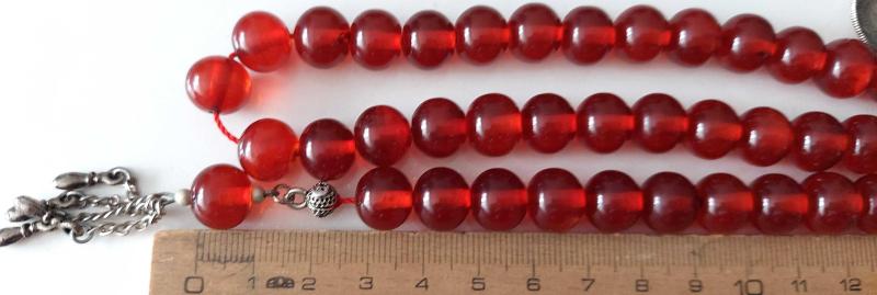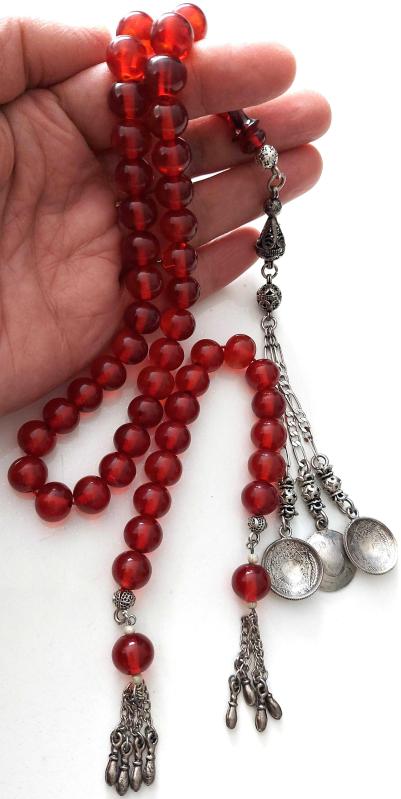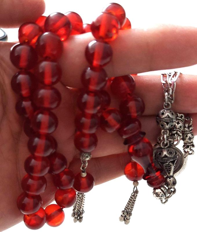 OSMANLI DÖNEMİ MALZEMEDEN YAPILMA ZAZA EL TESPİHİ İLE KIRMIZI RENKLİ GÜMÜŞ PÜSKÜLLÜ MUHTEŞEM SIKMA KEHRİBAR TESPİH 1UU2AA1 ÇOK NADİR