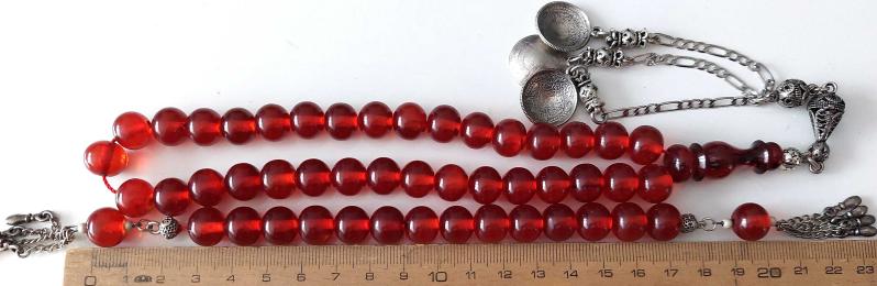 OSMANLI DÖNEMİ MALZEMEDEN YAPILMA ZAZA EL TESPİHİ İLE KIRMIZI RENKLİ GÜMÜŞ PÜSKÜLLÜ MUHTEŞEM SIKMA KEHRİBAR TESPİH 1UU2AA1 ÇOK NADİR başlıklı antika/koleksiyon objesinin menşei belirtilmemiştir. 1940-1959 arası dönemine aittir.